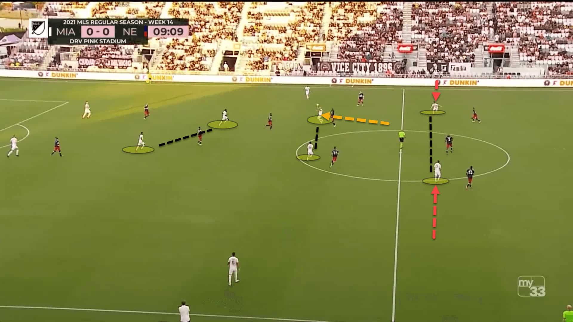 Here is an example of a positional attack from Inter Miami in a recent game against the New England Revolution. The players are all very far apart, making it extremely difficult to counterpress when the ball is lost as the connections between the players are stretched.