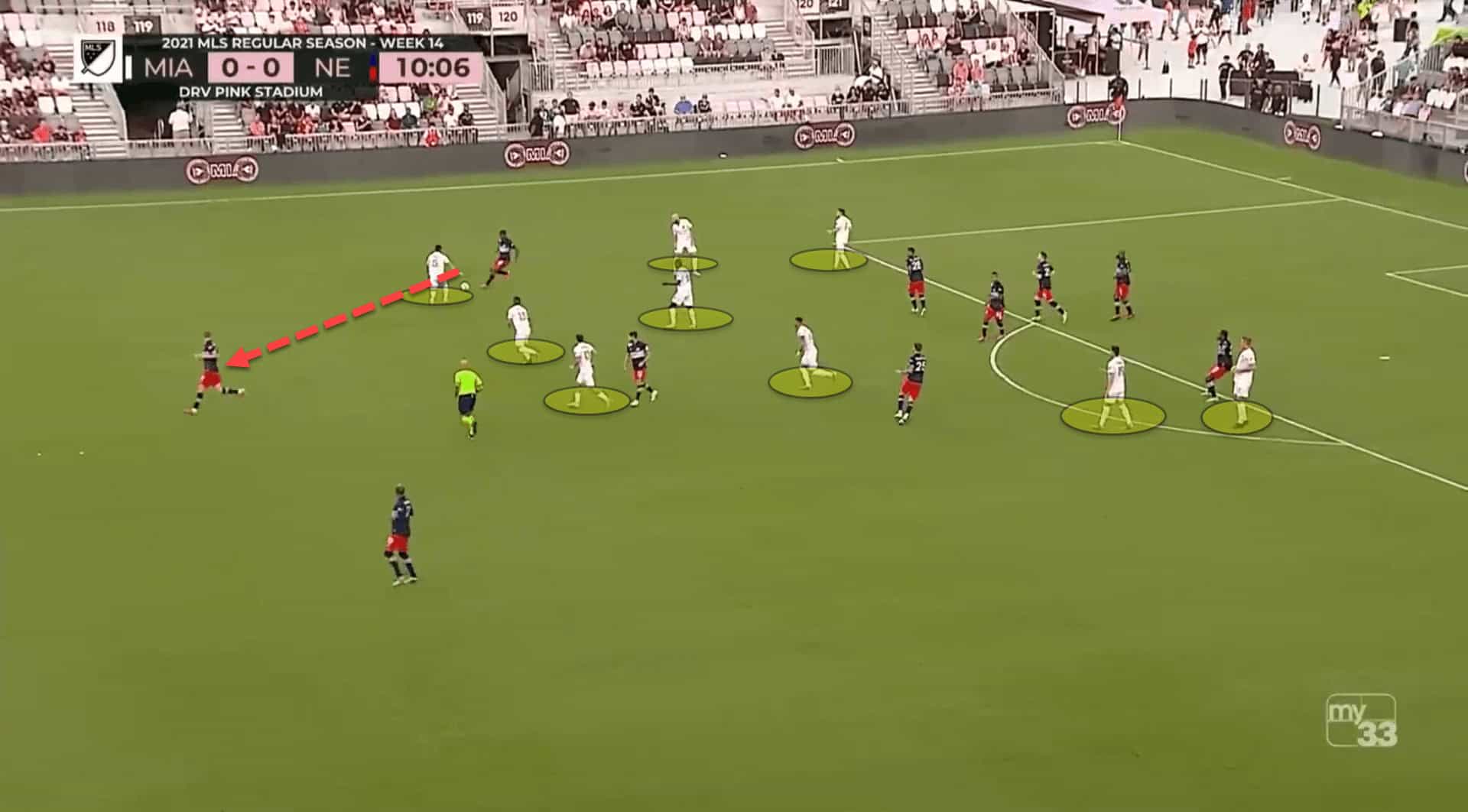 Of course, the issue with this is that there is just one player back defending the halfway line. If the opposition regains possession and bypasses the players surrounding the edge of the box, Miami are in extreme danger.