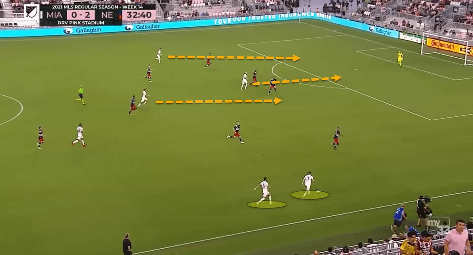 A hypothesis as to why Miami do not press high is because Higuain is extremely lazy when it comes to pressing opposition centre-backs. This can make it extremely difficult for Neville to set up his side defensively. Andrea Pirlo had the same issue with Cristiano Ronaldo last season at Juventus.