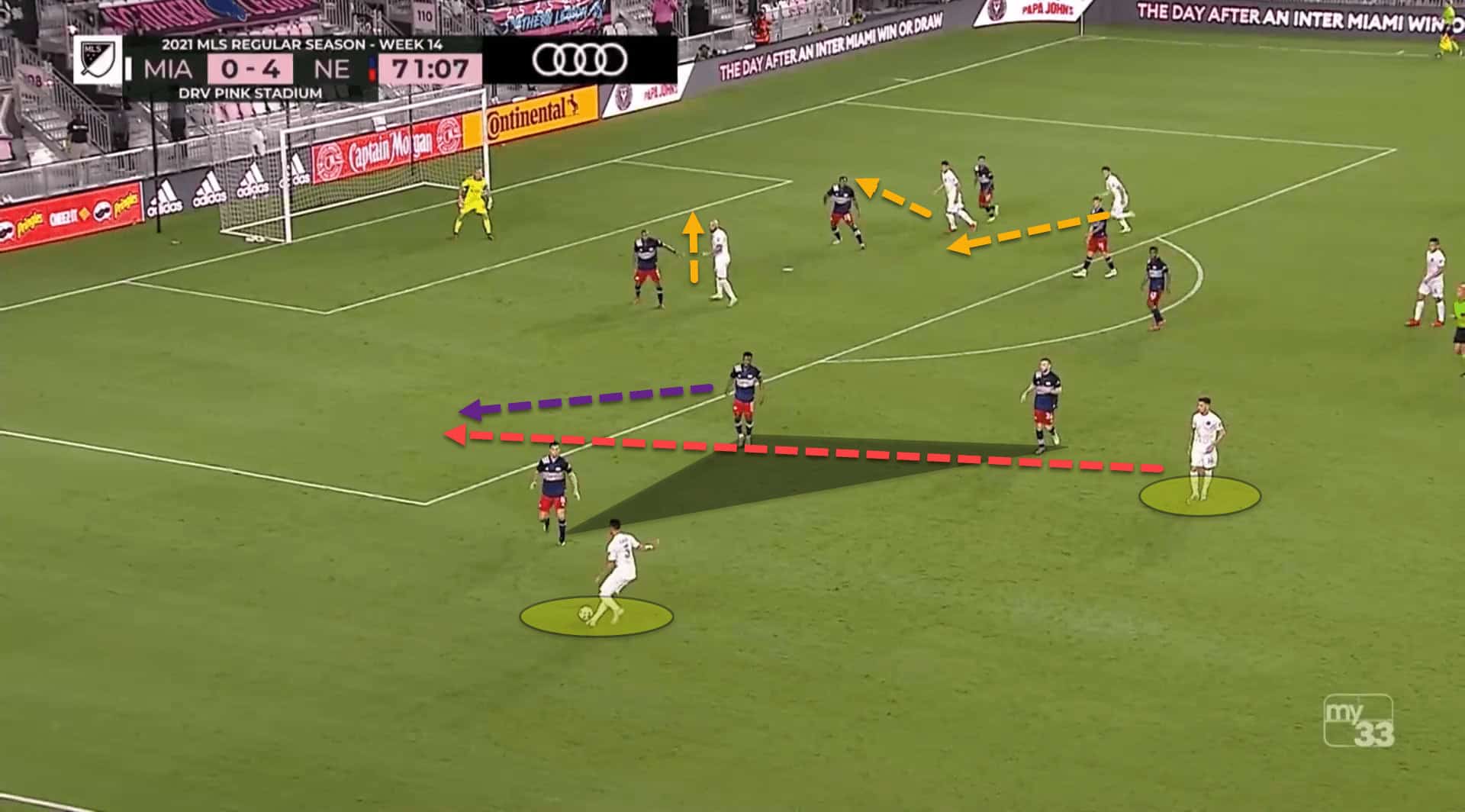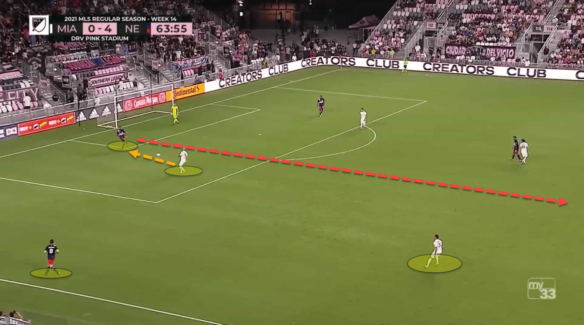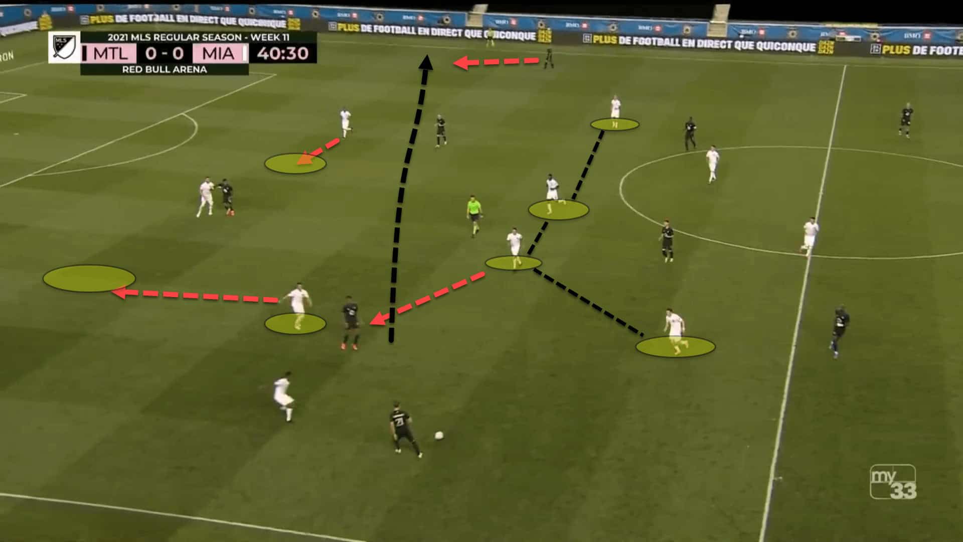 Now, here is an almost identical scenario against Montreal Impact, which Miami did not defend well against at all. The ball-near midfielder did not drop and pick up the player in the halfspace, staggering the midfield. Instead, the ball-near centre-back was forced to come out and aggressively close him down.