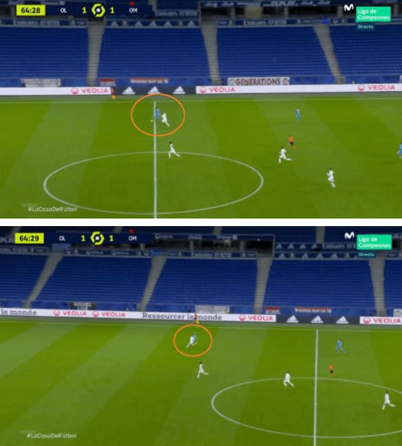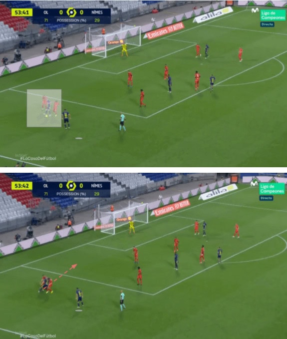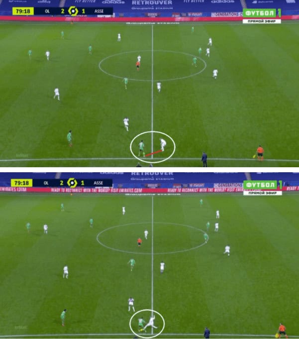When the opposite full-back marks the inside forward it gives Bard a lot of space to deal with and use his attacking capabilities, about which we will discuss in the following section, or when he is marked it stretches the opponents’ defence opening spaces inside. In the image below shows the Monaco right-back getting drawn to Bard and hence leaving his position to open space into which Dembele makes a run.