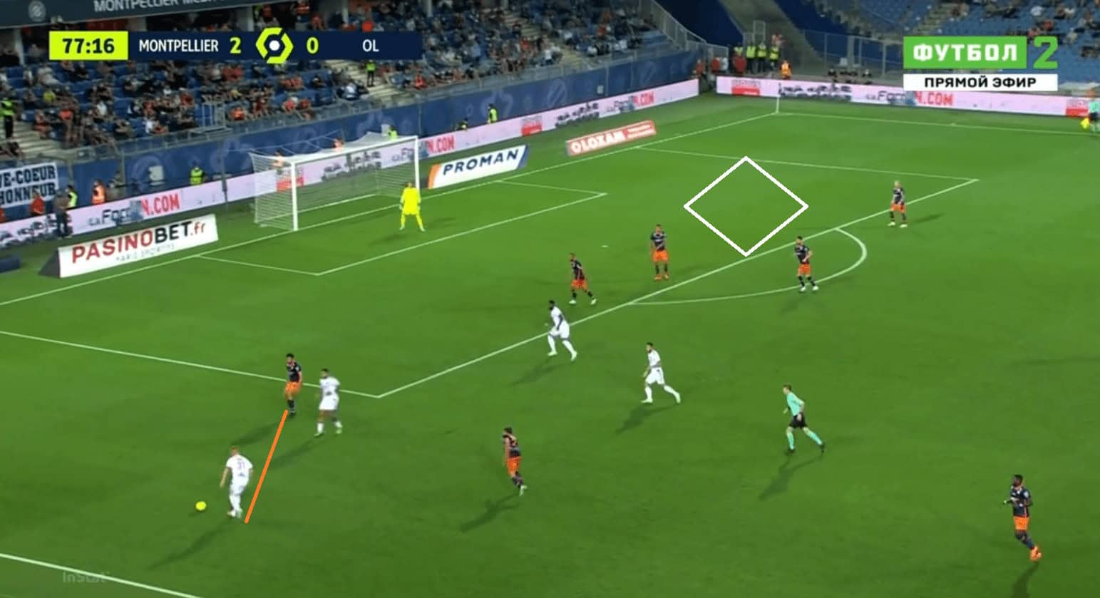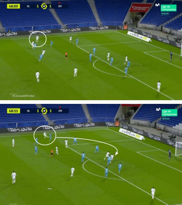 In the above example. Bard is chasing a Marseille player in a counter-attacking situation. Initially, he is behind but catches up with him using his brilliant pace and also in the second image we can see his body position as he closes a chance for an inward run for the opponent player to delay the attack. The opponent player then without any other option tries to trick him but he intercepts the ball from the player easily.