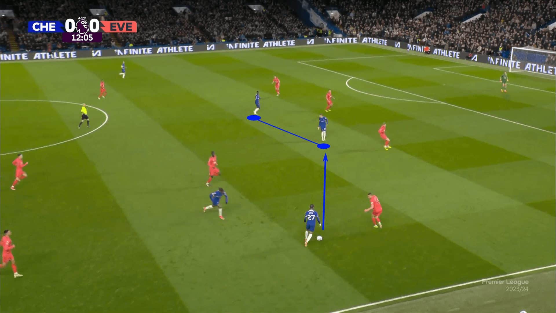 Looking at the Everton backline, their body shape shows that they are concerned with a ball played in behind and are conceding some ground to the Chelsea attackers.