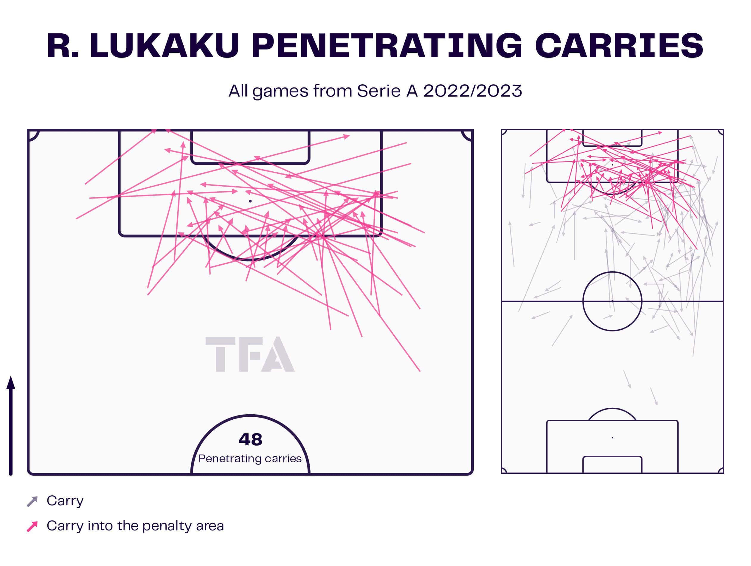 Another aspect of Lukaku’s game that he has genuinely honed is his ability to carry the ball into the box. From the diagram above, we can also start to see that Lukaku receives the ball predominantly on the right-hand side and, from there, looks to cut in and drive at the defence. As a result, Lukaku can consistently carry the ball into the opposition penalty area.