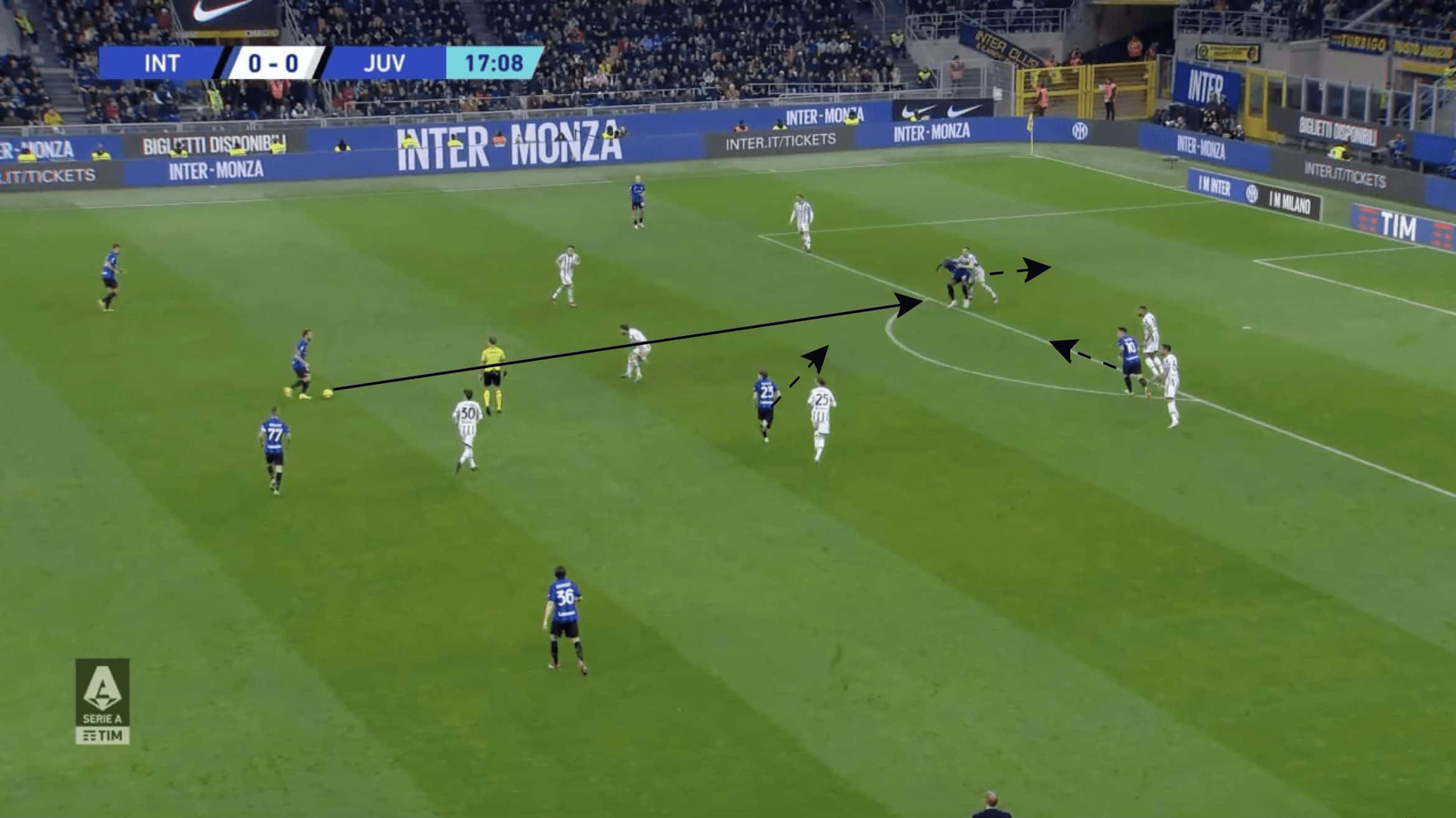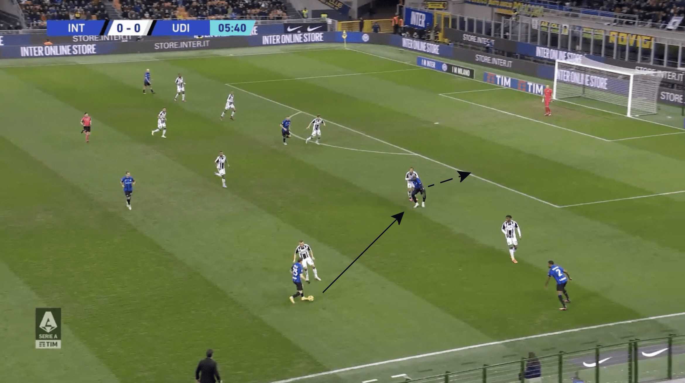 For both Conte and Inzaghi, Lukaku has drifted across the opposition backline, using his strength to hold off the opposition defender behind him and lowering his stance slightly, which gives him a greater base of support. This can be seen in the image below, with Lukaku able to utilise his strength to hold off his defender before being able to back up his opponent as well.