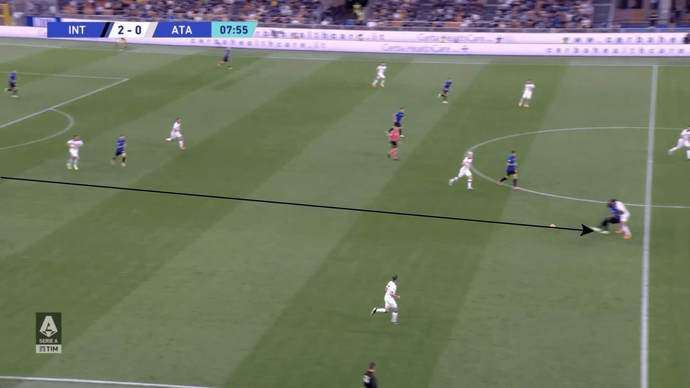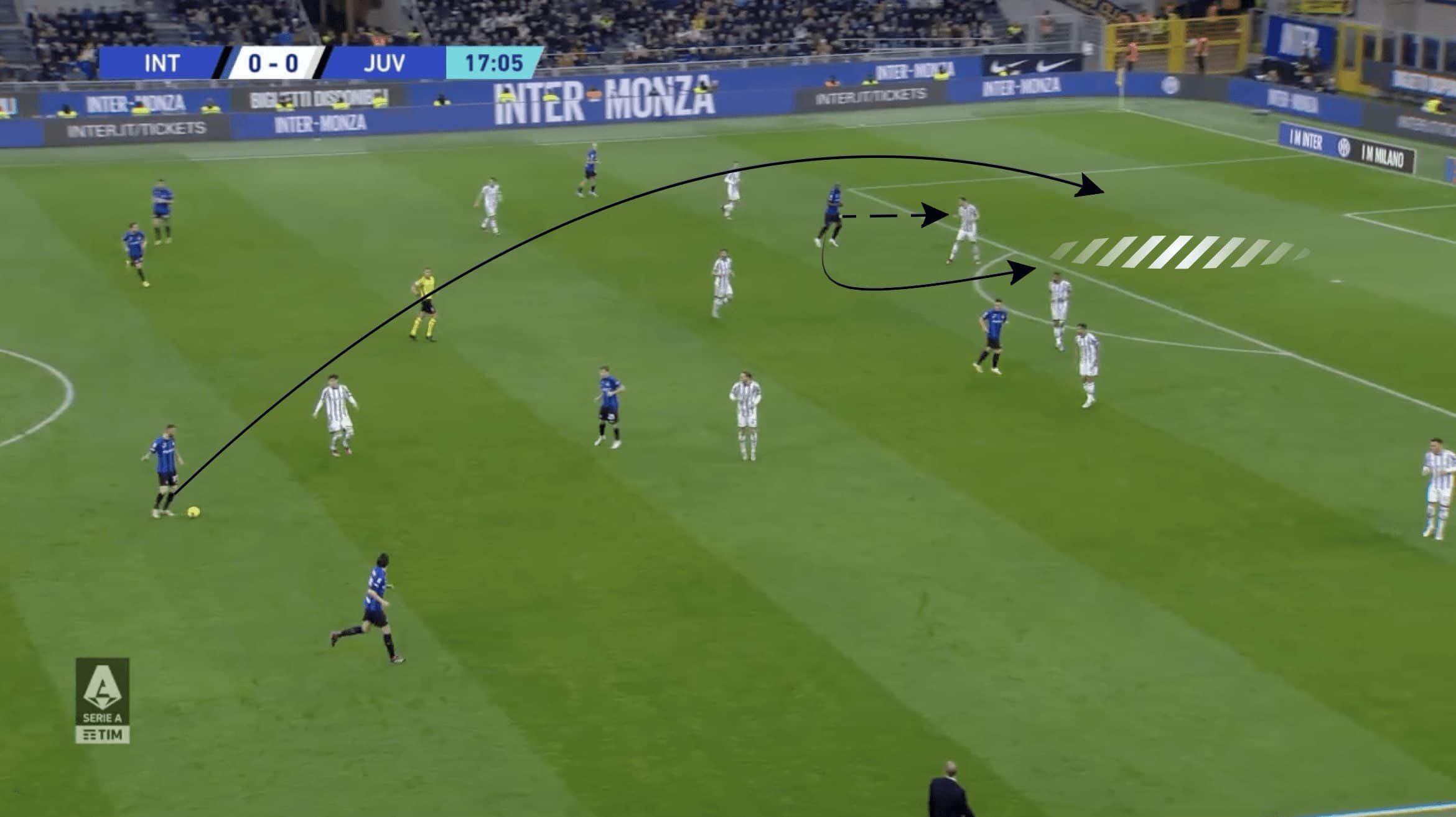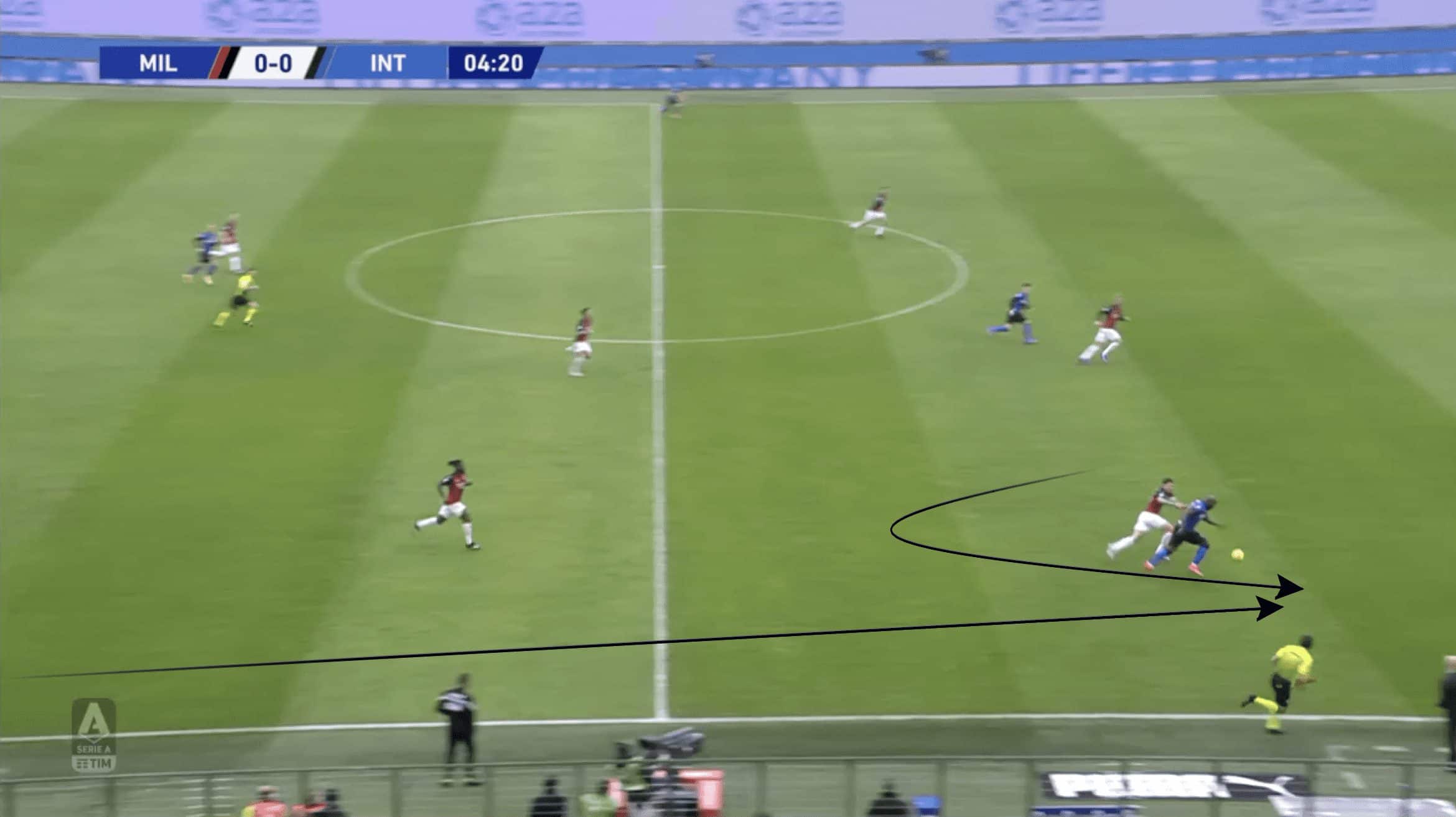 Lukaku has also shown himself to be particularly strong on the right-hand side, in situations where he can drive forward with the ball into space, either in a 1v1 against players in the backline or on the shoulder of one of the defenders in the back line. This can be seen in the image below.