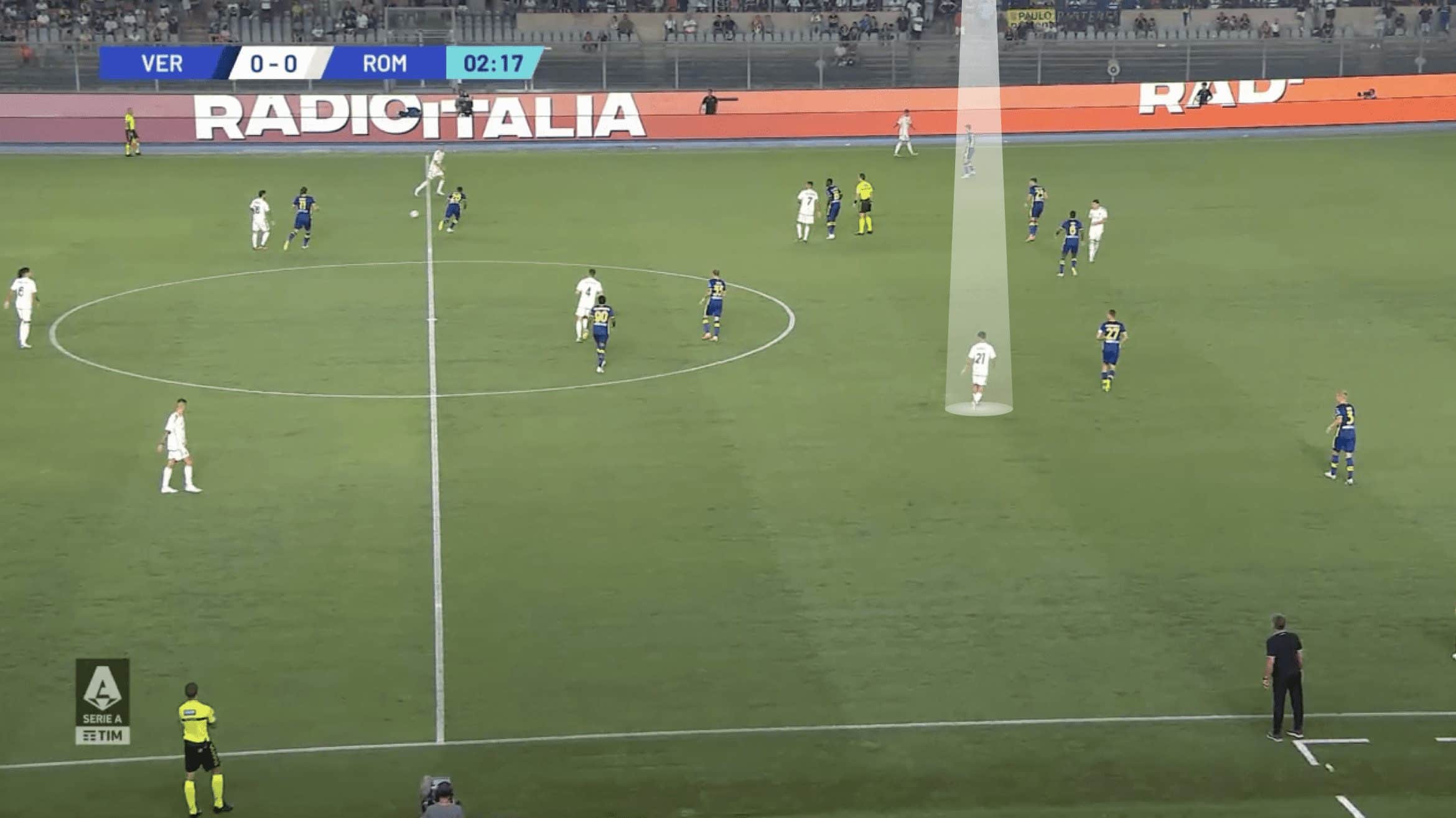 As can be seen in the image below, Rasmus Kristensen keeps his position and does not make any movements towards the centre or down the touchline. One aspect Roma can take advantage of is Kristensen’s athleticism and strong running, combined with Lukaku’s ability to hold off defenders and hold up possession.
