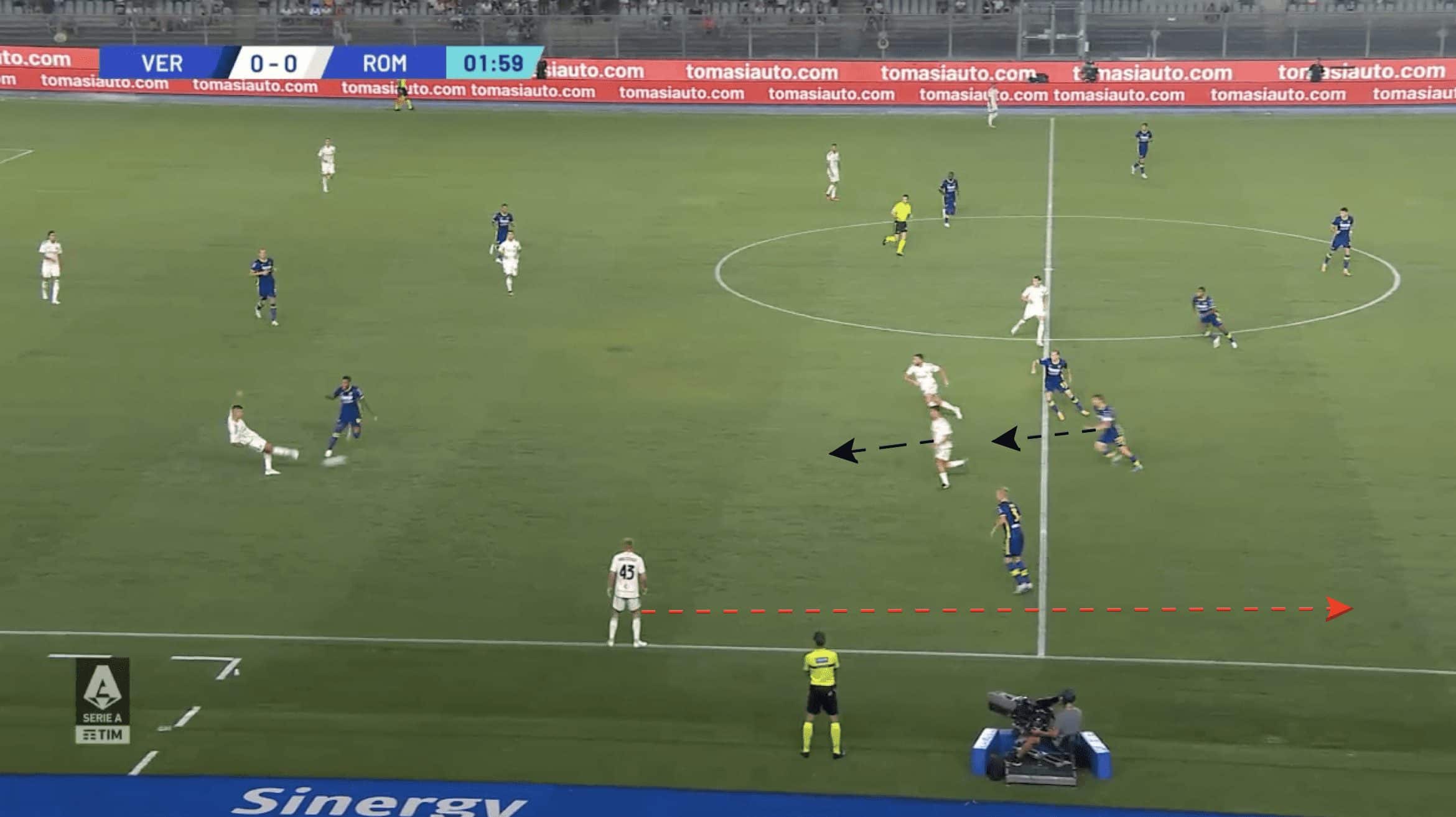 Lukaku also provides Roma with a different dynamic on the right-hand side compared to Dybala. As can be seen in the image below, with Gianluca Mancini on the ball, Dybala begins to drop slightly deeper in order to provide an option for Mancini.