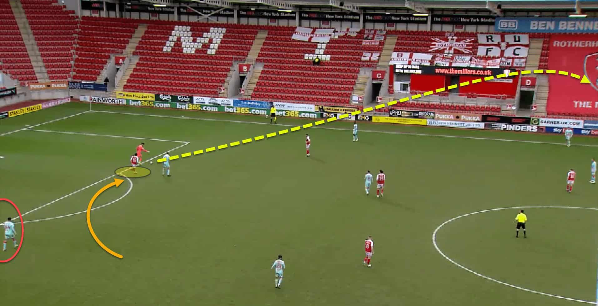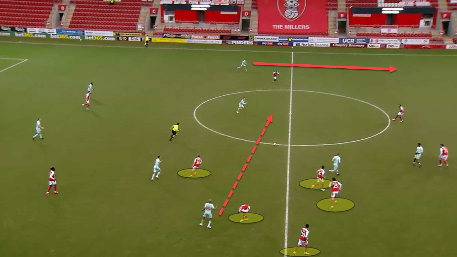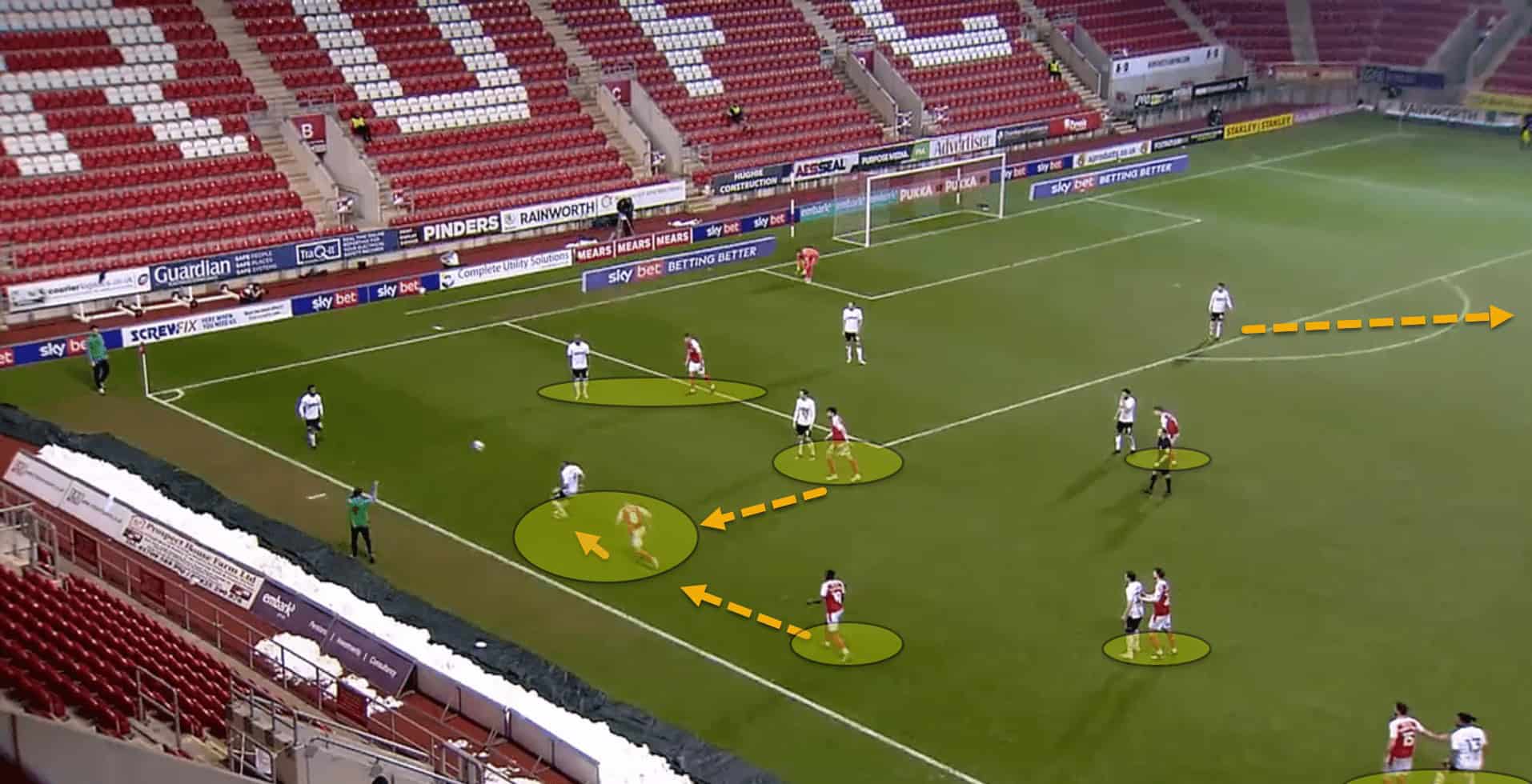 Again here, having failed to win back possession from their counterpress, Rotherham are carved open due to the gaps left by committing so many bodies, eventually conceding from a very similar situation as the last.