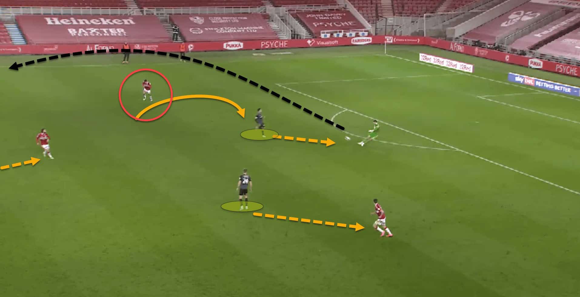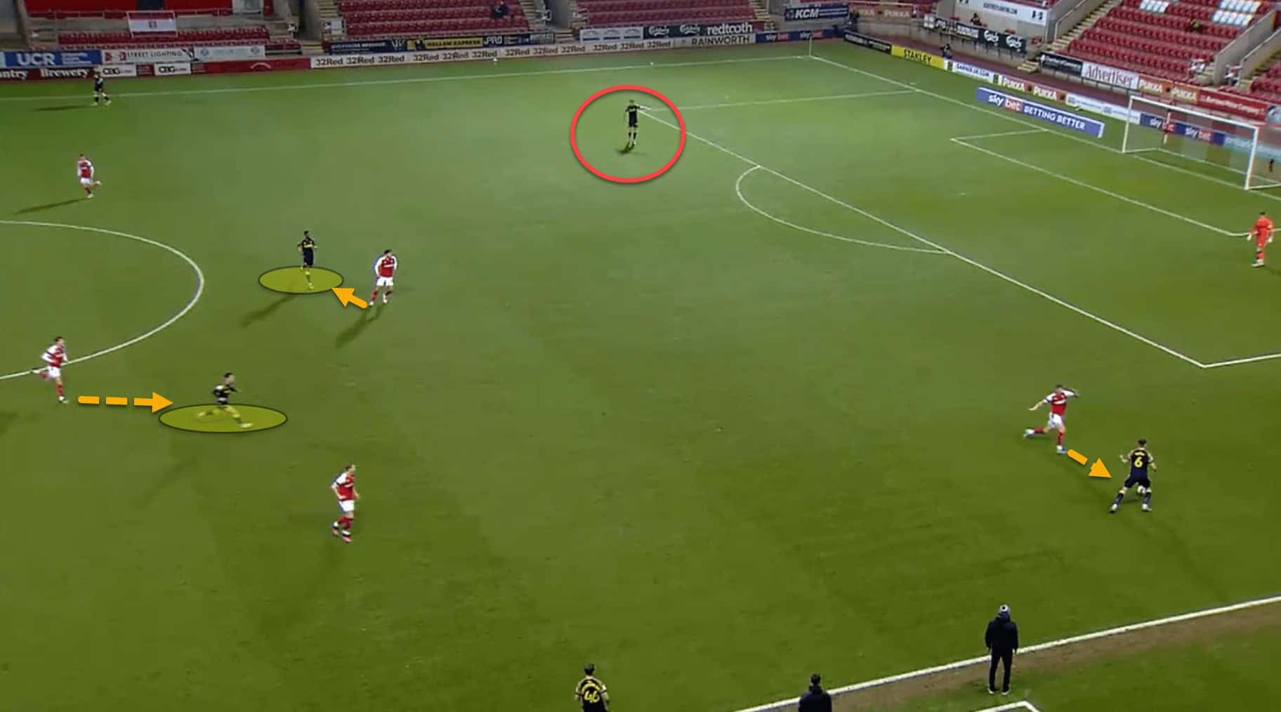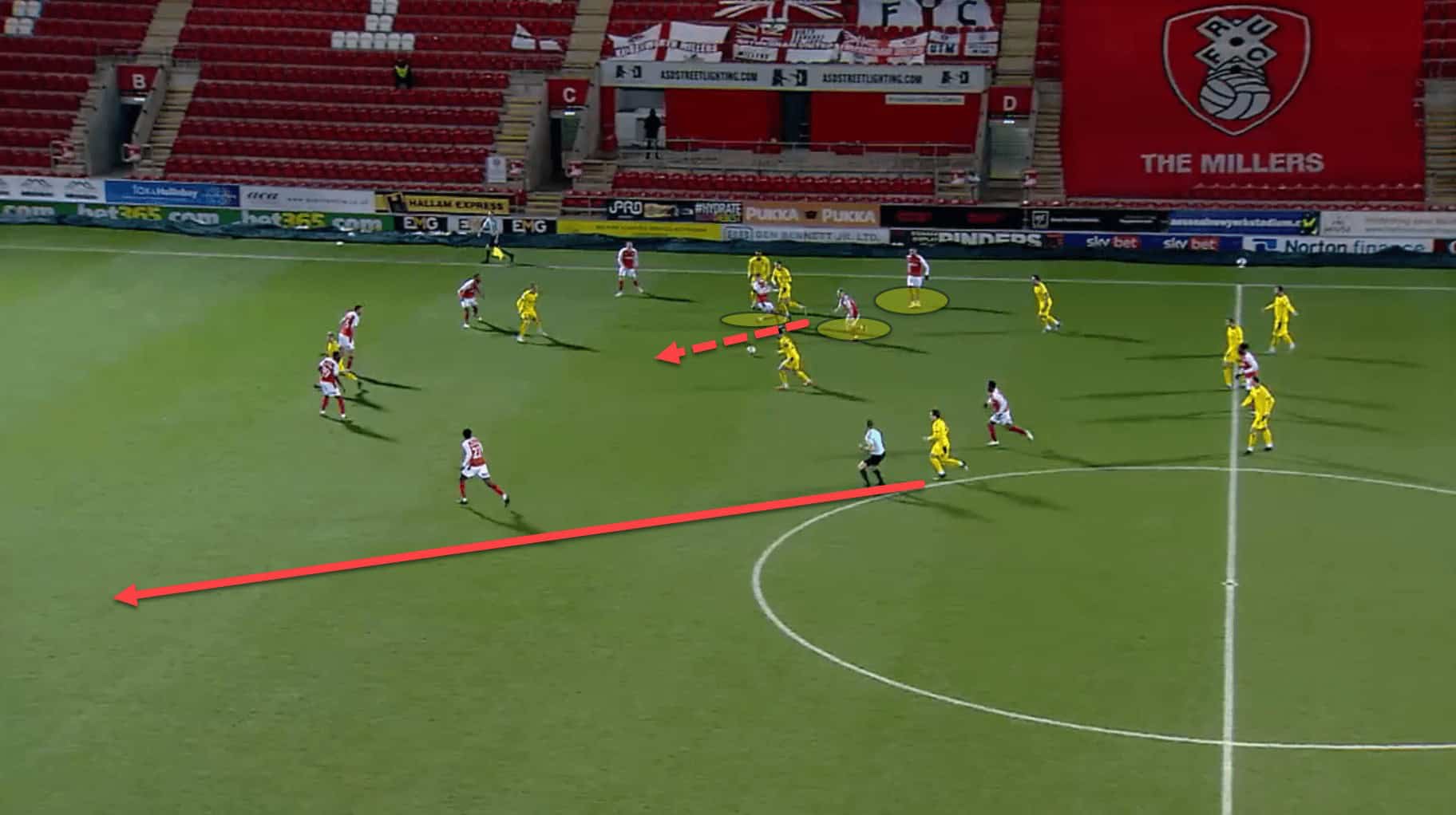 Again here, having failed to win back possession from their counterpress, Rotherham are carved open due to the gaps left by committing so many bodies, eventually conceding from a very similar situation as the last.