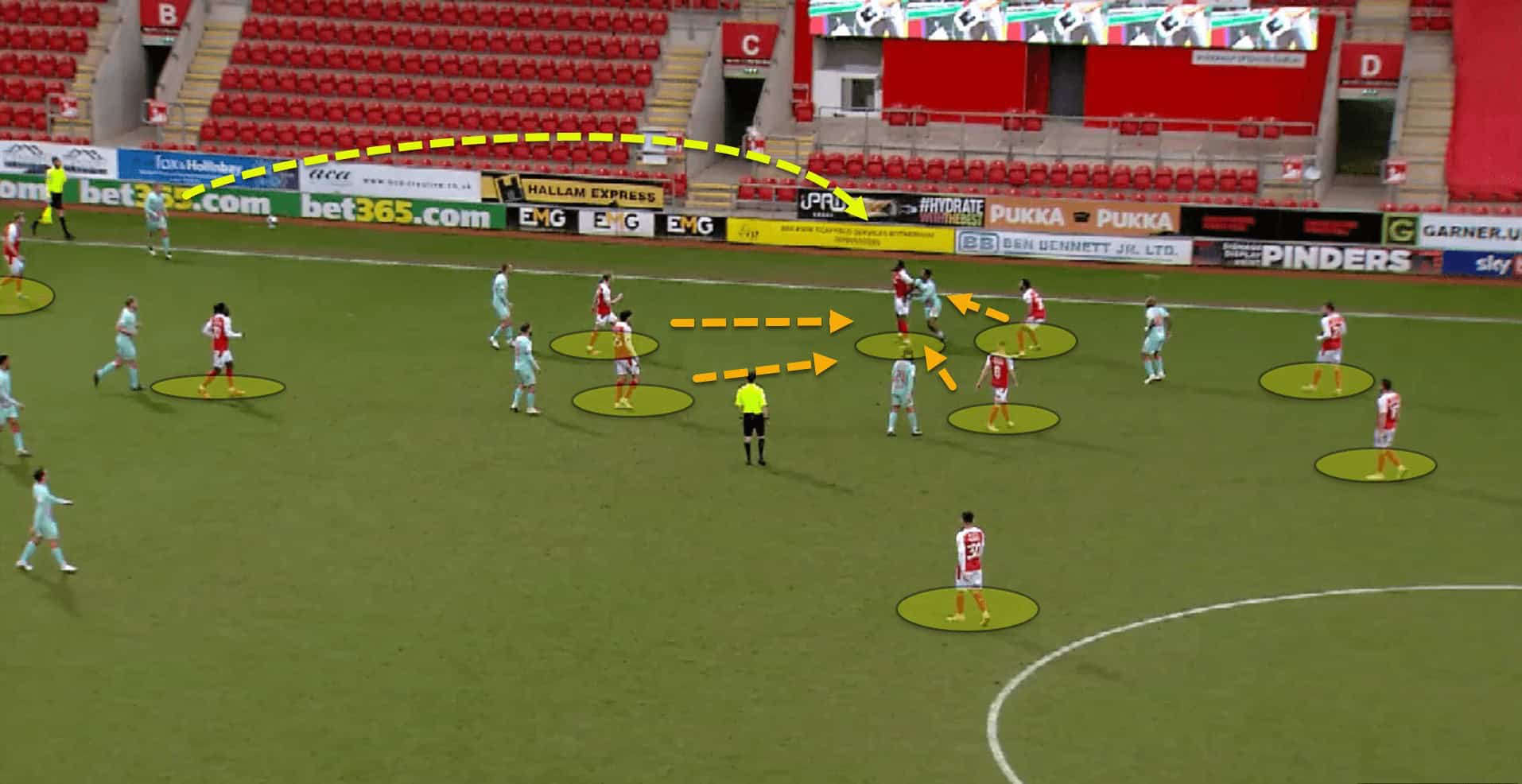 However, the players do not press in coordination with one another, which can make it very easy for their opponents to find space by dragging Rotherham’s players out of position.