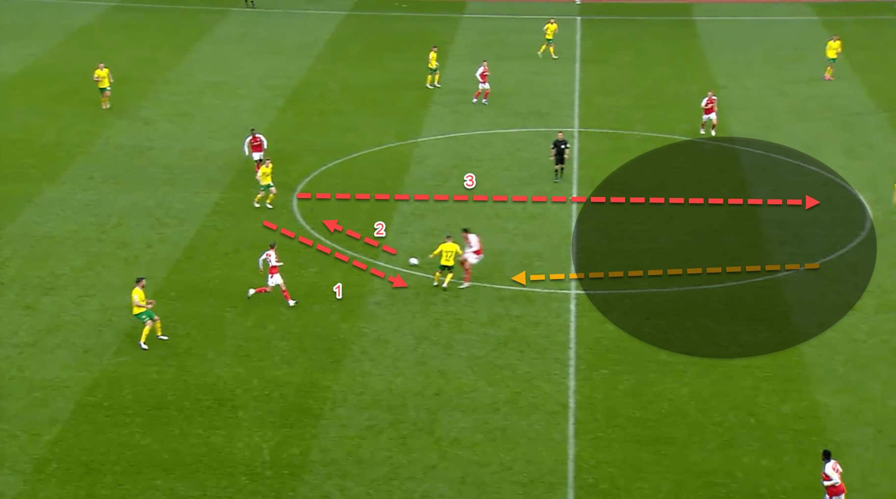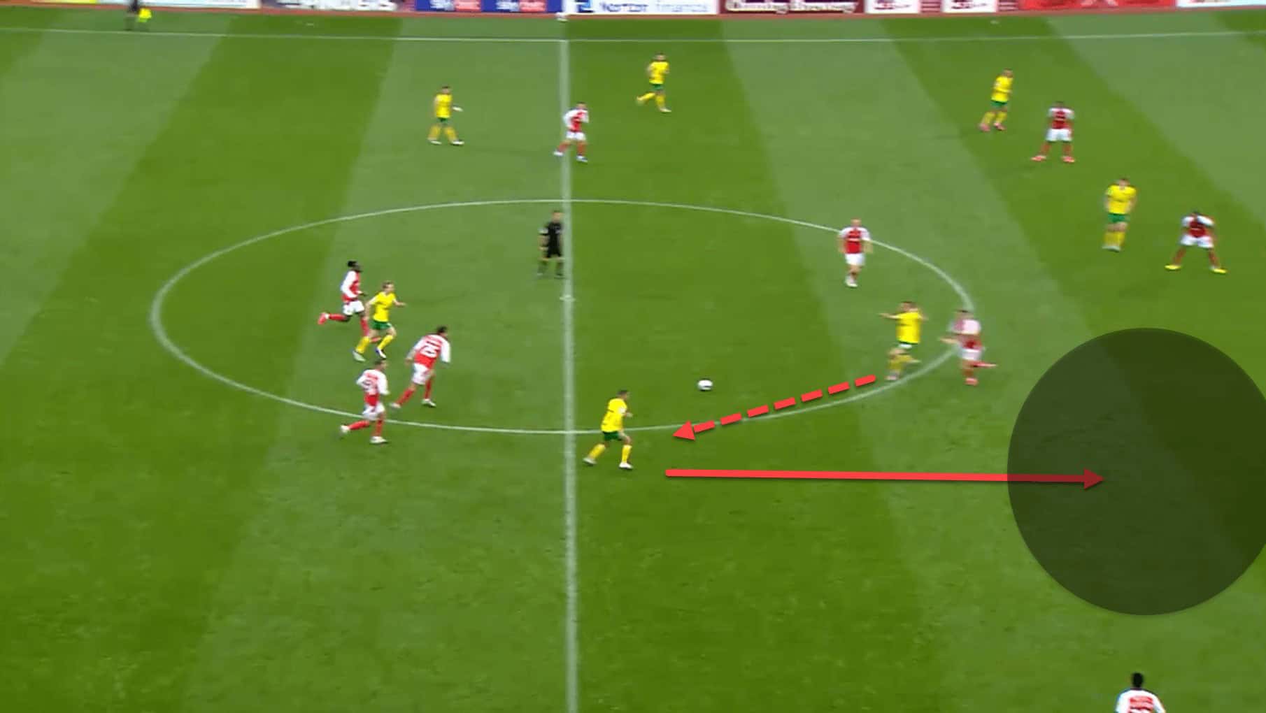In this image, Norwich have utilised the up, back, and through passing method to play through Rotherham’s midfield. When the first pass is played, the nearest central midfielder is dragged out to close him down before the ball-player can turn on the ball.