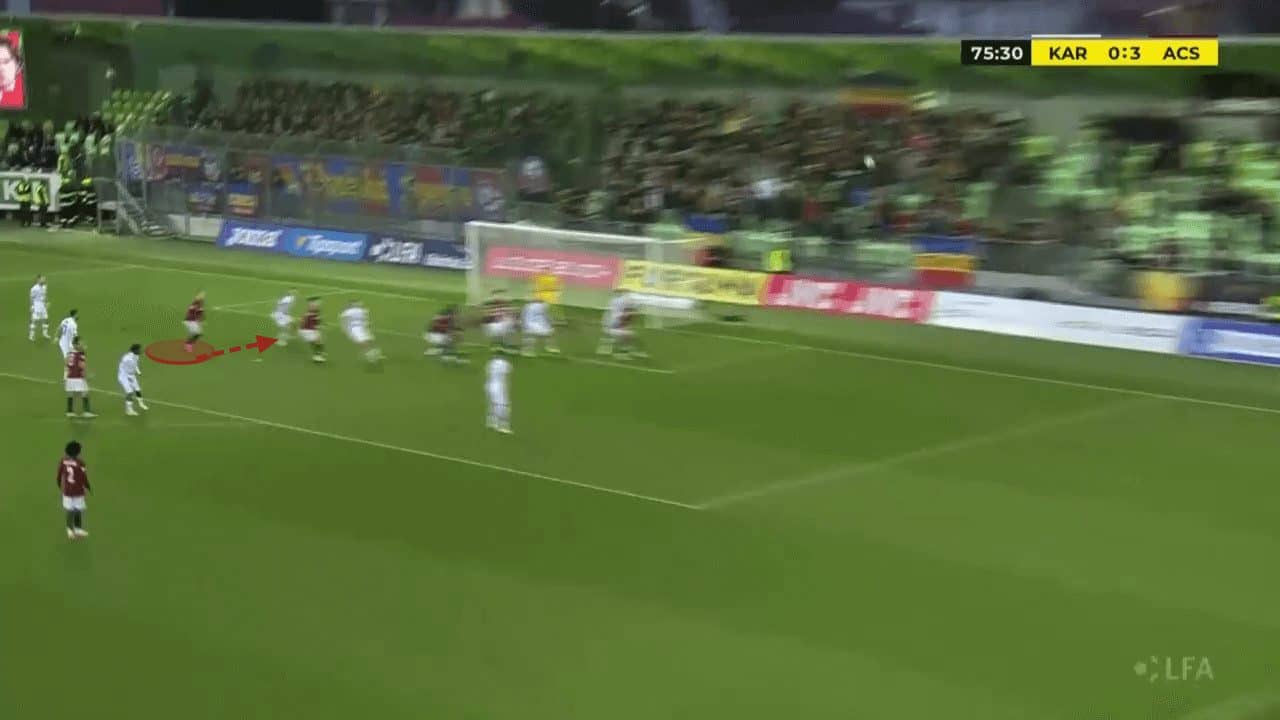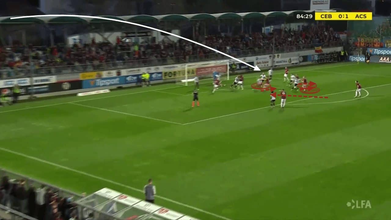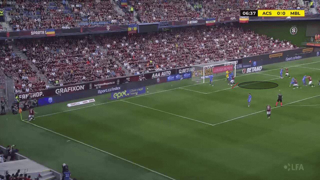 Another common way teams can start counter-attacks is through a volleyed clearance at the near post. However, with the Czech champions opting for more floated crossing techniques, the likelihood of a cross being severely underhit is minimised.