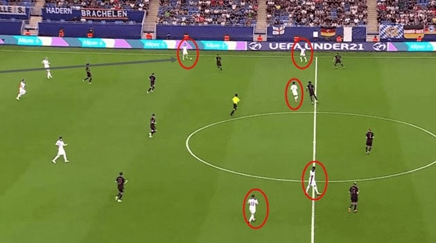 The dynamic movements and rotations of players often look free-flowing and improvised, but they are usually pre-determined. When implemented correctly, it can be challenging for opposition teams to position themselves to thwart attacks. As well as drilling these movements into the players, they must also learn how to react when things go wrong. Losing the ball is inevitable at some point. England U21s were excellent at making sure losing a goal from these transitions was not also inevitable.