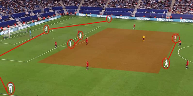This now means that the attacking team has more decisions to make and must be more aware of the defenders positioning. They have to decide whether they should continue circulating the ball, switch it or play a line-breaking pass through the middle.