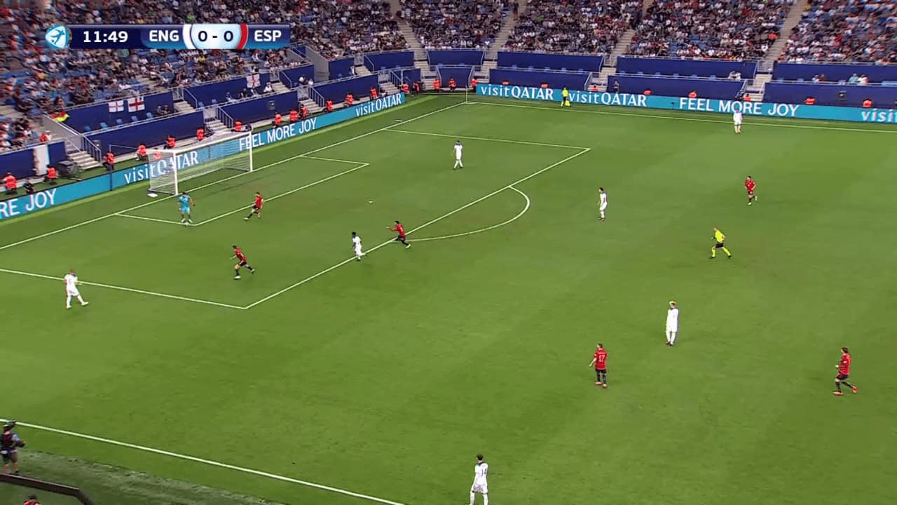 The above image shows an England goal-kick in the final against Spain. England made subtle adaptations to their positioning for goal-kicks in this match. The left centre-back still took the kick and was positioned inside the box. The opposite centre-back, however, was moved to the outside of the penalty area (just out of shot).