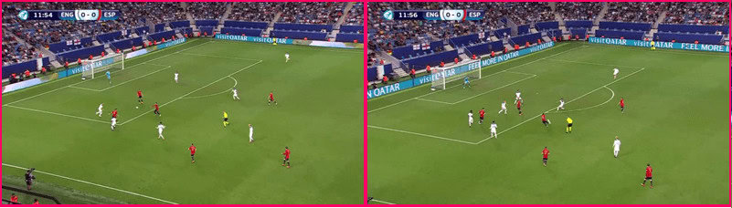 This made it more difficult for the two forwards of Spain to cover both centre-backs. Both forwards could not position themselves parallel or even within pressing distance of each centre-back. If they had, they would have opened it up for one of England’s two central midfielders to get on the ball.
