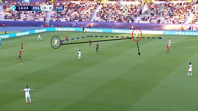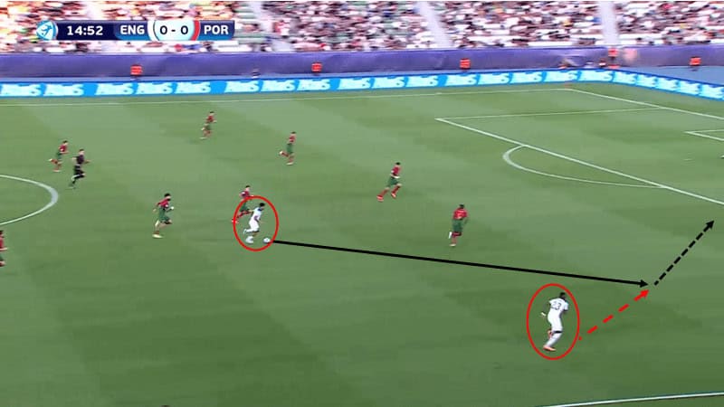 Aarons then backtracks to a more advanced position to create a gap between Portugal’s two defensive midfielders and their front four. At this point, England have effectively gone from a 4-2-2-2 into a 4-3-3 whilst the ball has been moving. Jacob Ramsey, positioned as the striker, then darted from the defensive midfielders’ blindside into the space created by Aarons.