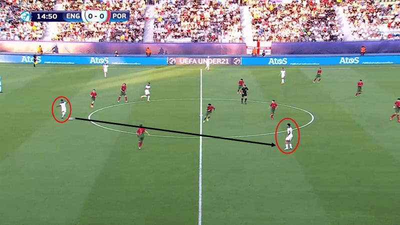Gibbs-White then attacked the space ahead of him with the ball before playing his right forward in behind. Here, the positional discipline initially of Gibbs-White, allowed him to receive in a difficult position to defend against. Then, the patience of his wide forward kept the Portugal defence pinned back and eventually allowed England to exploit the wide areas. This style of build up, which is very enjoyable to watch, can only be described as a mix of very dynamic movements coupled with positional play.