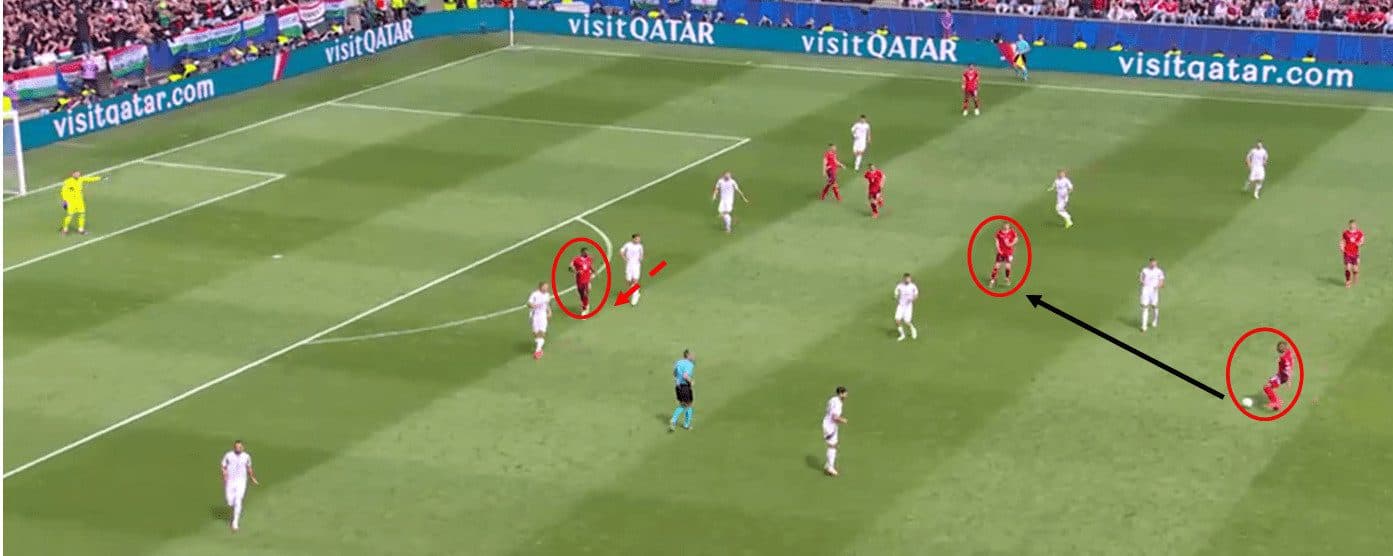 The above example of a striker moving to receive in behind comes from Switzerland’s 3-1 win over Hungary. Switzerland forward Kwadwo Duah opened the scoring with a simple but clever and effective movement that allowed him to receive behind the oppositions backline.