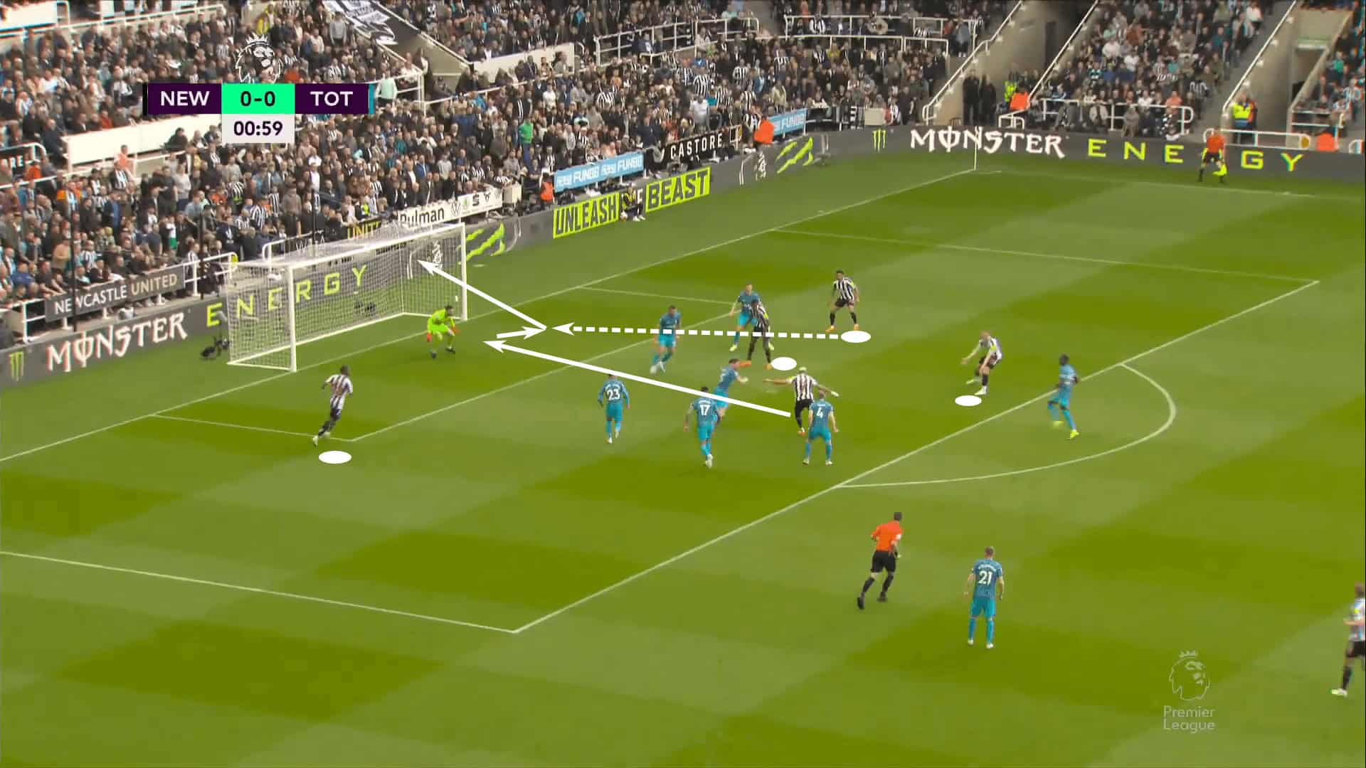 The winger was in a 1v1 scenario. He was given an overlapping run, allowing him to cut inside and take a shot for central position. Lloris made the save but pushed the rebound into the feet of Jacob Murphy for the opener just 60 seconds into play.