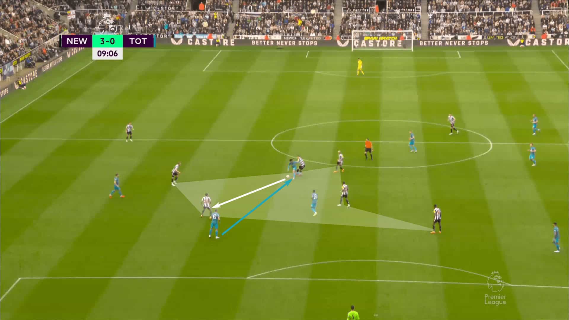 That was key to their first goal in the rout of Tottenham. With the recovery coming in the middle third, the first pass was played forward, the second sent back into support coming from midfield, and the third played high into the wings to the feet of Joelinton.