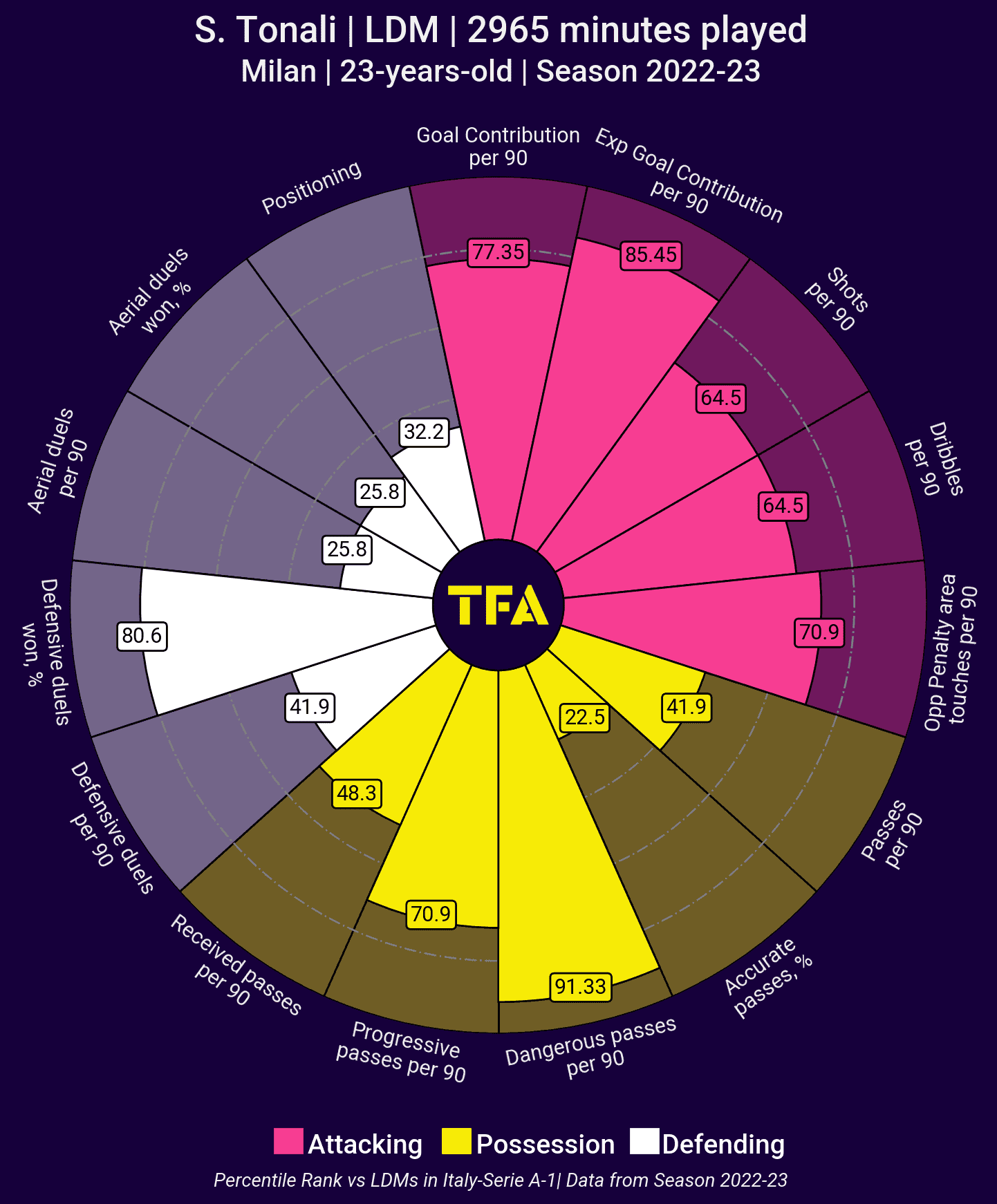 He’s a deep-lying midfielder with a knack for scoring goals. Though he plays a deeper role, he’s an exceptional attacking player with a flare for dynamic playmaking. Whether on the dribble or with his scintillating passing, Tonali gives the Newcastle midfield another creator.