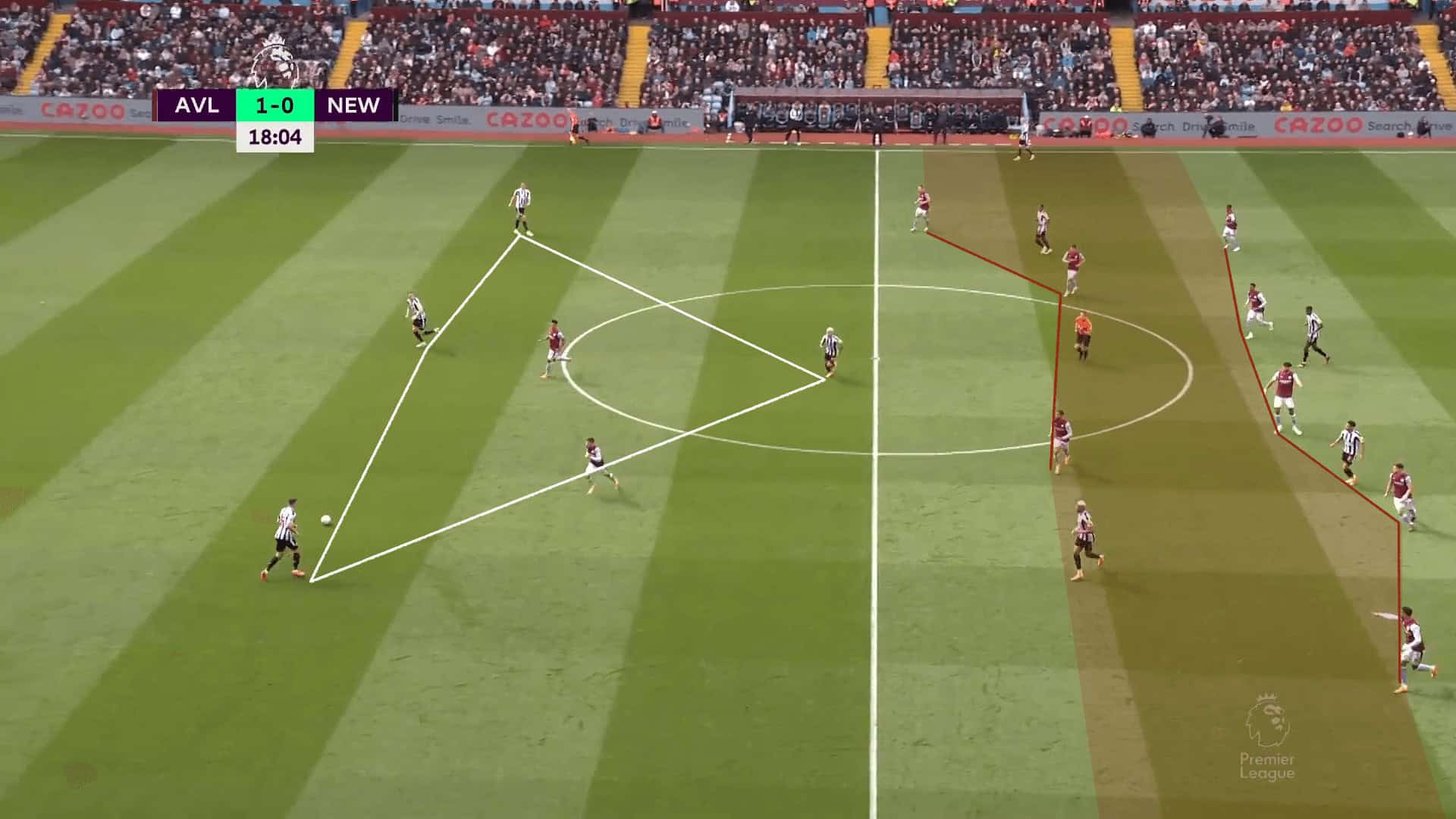 In this Aston Villa example, the first image shows the midfield and backlines are approximately 6m apart. Notice the positioning of the Newcastle midfield. One is low, and two are high. When that high space is unavailable, one midfielder will check to the ball to offer support and possession and drag a defender with him higher up the pitch.