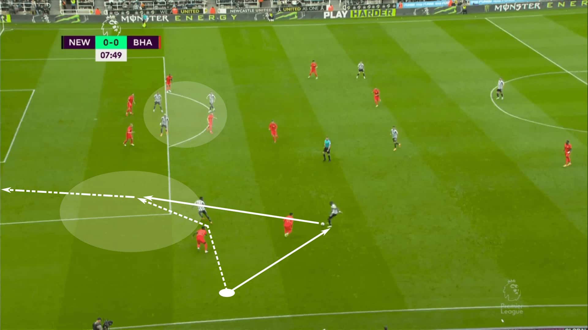 When they aren’t going for the killer pass, look for Newcastle to create a limited number of overloads in the wings, often in 1v1, 2v1 or 2v2 scenarios, before sending a delivery into the box. In our example against Brighton, the 2v2 leads to a dangerous move into the penalty box with three attackers in the high central overload. Newcastle had a fantastic setup to attack the box, but a poor delivery from Alexander Isak allowed Brighton to clear the ball.