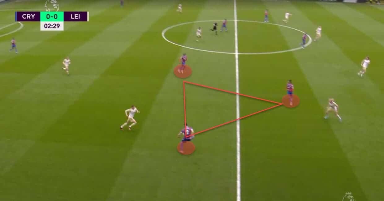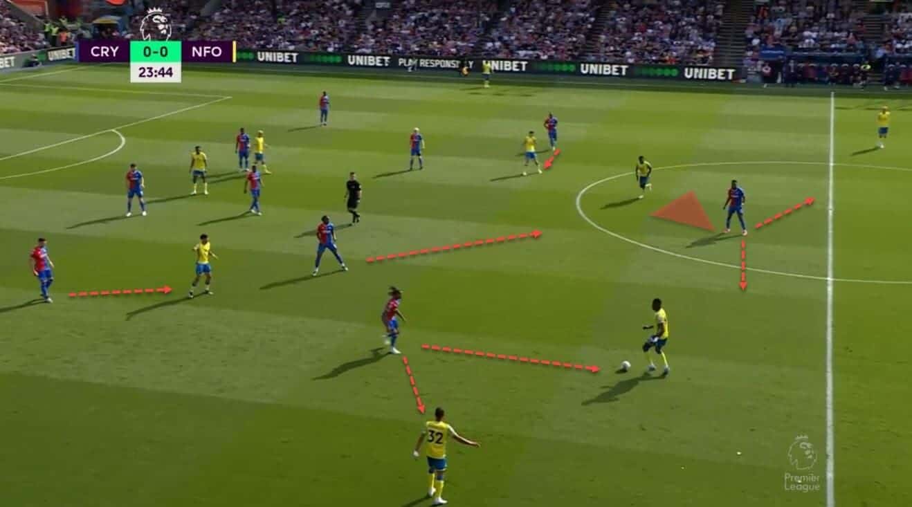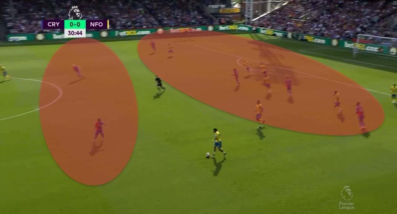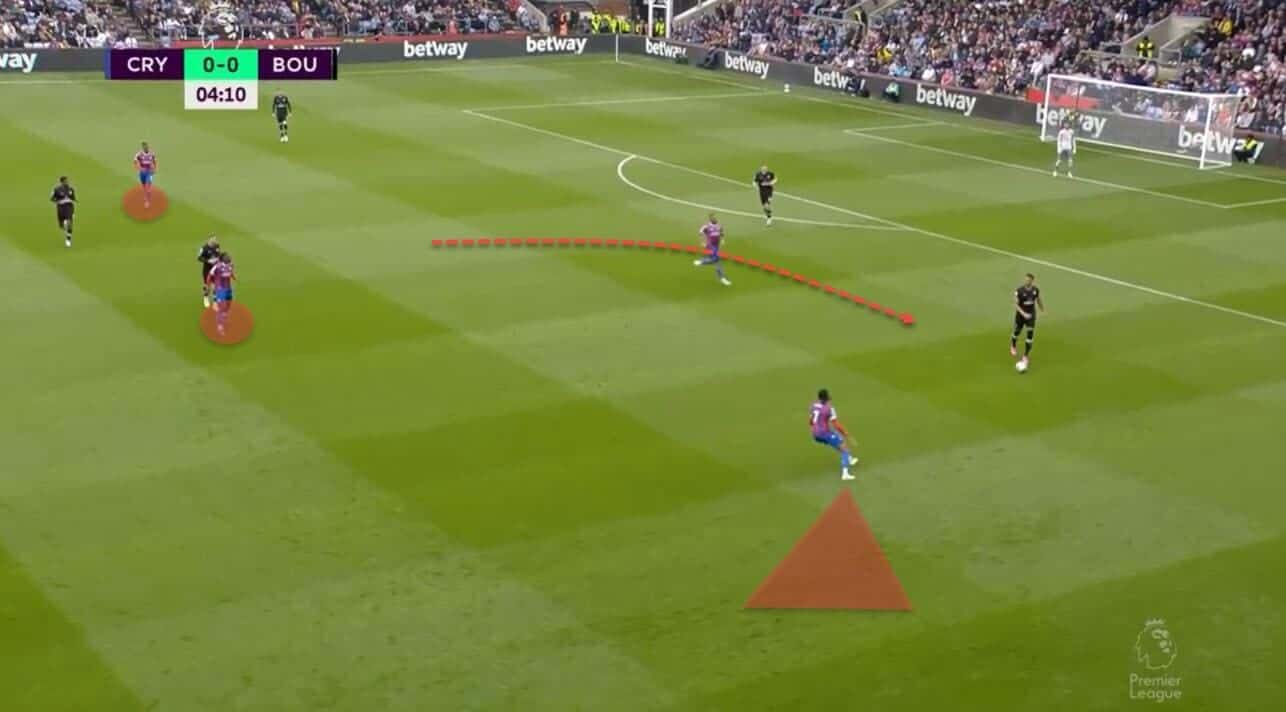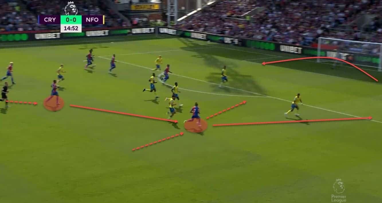 Having the distributors deep and ensuring there’s always an outlet in case the build-up is clogged up is an excellent way to break the opposition’s press effectively. Palace would often do just that, aiming for the runners attacking space and then relying on their raw speed and unpredictable nature to finish off the job. Naturally, this wasn’t always as successful, nor was it the only way for them to attack, but it did play to some of their star forwards’ core strengths.