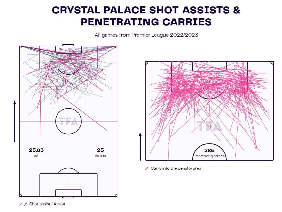 They have generated 25 assists from 25.83 xA and completed 285 penetrating carries in 2022/23, both of which, combined with their 37 goals from 40.88 xG, brought them from the brink of relegation to a comfortable mid-table finish. Clearly, the tactics worked as imagined, and Hodgson lived to fight another day. However, upon closer inspection, all is not what it might initially seem.