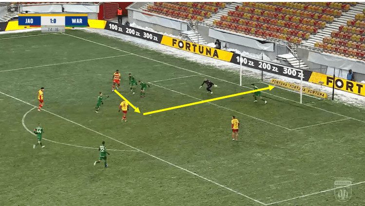 For this goal, you can see the effective fluid off-the-ball movement that Jagiellonia can use to score in the defence-attack transition if they are given the opportunity.