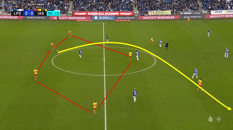 This, in turn, rushes the opposition, and they force the ball down the Jagiellonia left flank, where they can regain possession comfortably.