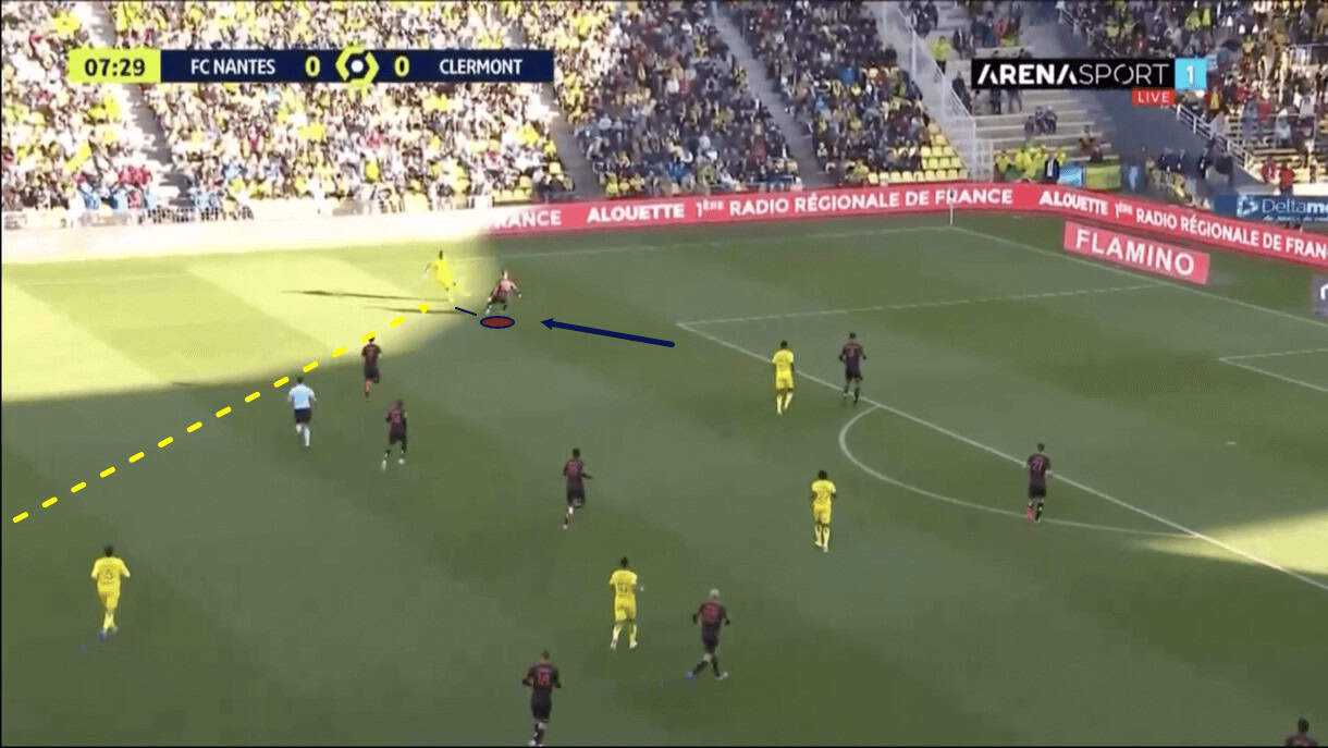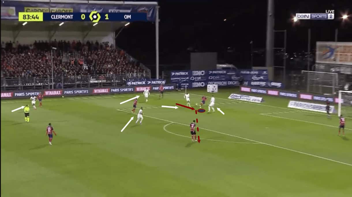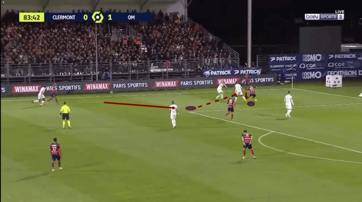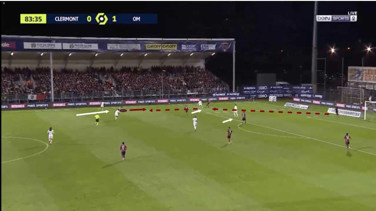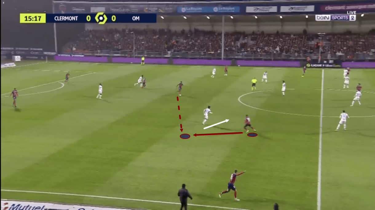 With an opposition midfielder just dropping into the passing lane between Zedadka and the central midfielder here, the right-back quickly shifts in the opposite direction, dropping slightly deeper to get out of this Marseille player’s cover shadow and make himself a better passing option for his teammate. As the play moves on, the Clermont midfielder takes up the option of passing to Zedadka and the right-back helps his team to progress into the opposition’s half.