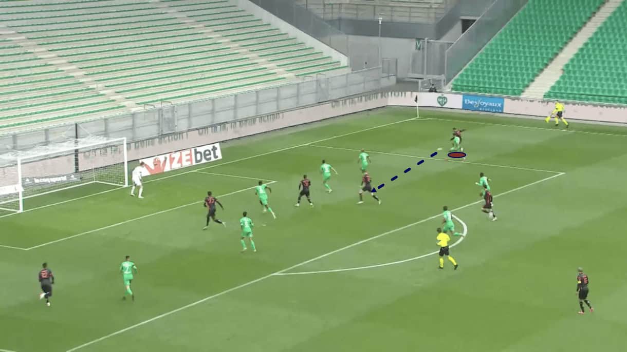 Sometimes, the right-back makes the wrong call. We see an example of this in figure 5, taken from Clermont’s recent Ligue 1 clash with Saint-Étienne. Les Lanciers’ holding midfielder is in possession here, aiming to progress through Saint-Étienne’s disciplined mid-block. The holding midfielder lines up a lofted through ball for Zedadka at the same time as Zedadka opts to drop deep and try to give this player a short passing option deeper in the more traditional right-back position. This moment of miscommunication leads to the ball flying out of play, while it could also lead to a cheap turnover, giving the opposition a good opportunity to counter-attack.