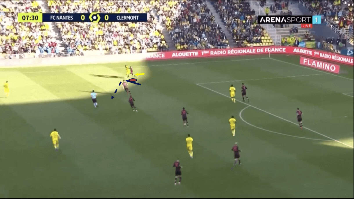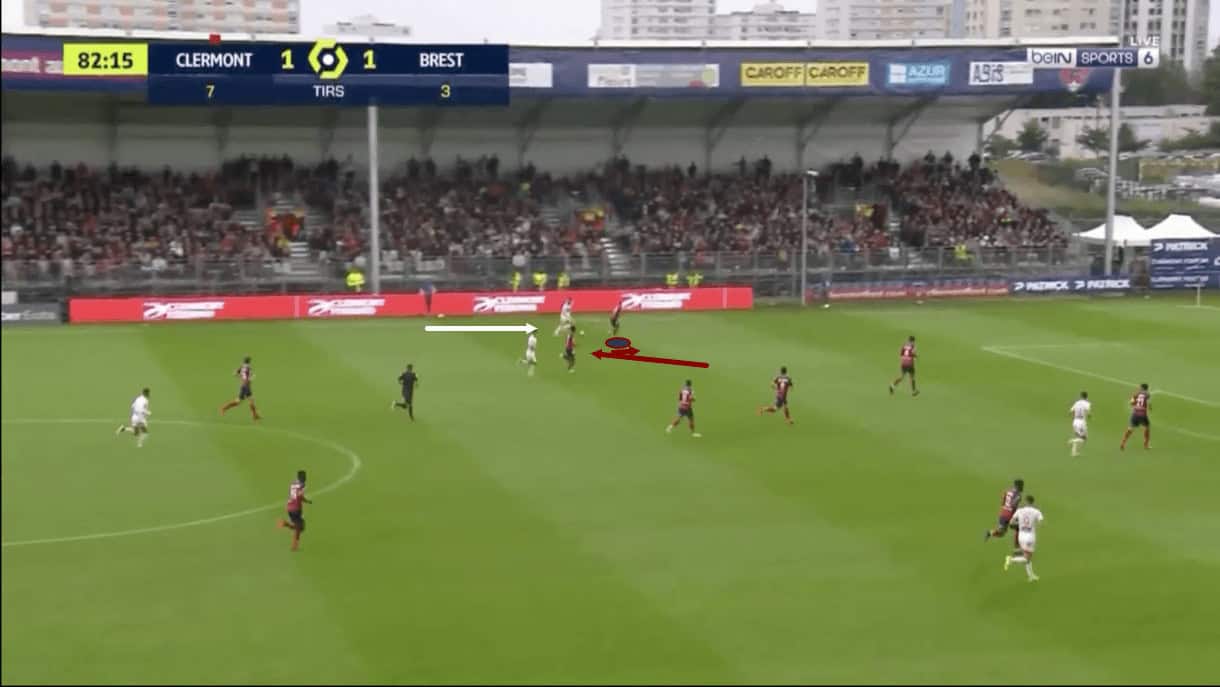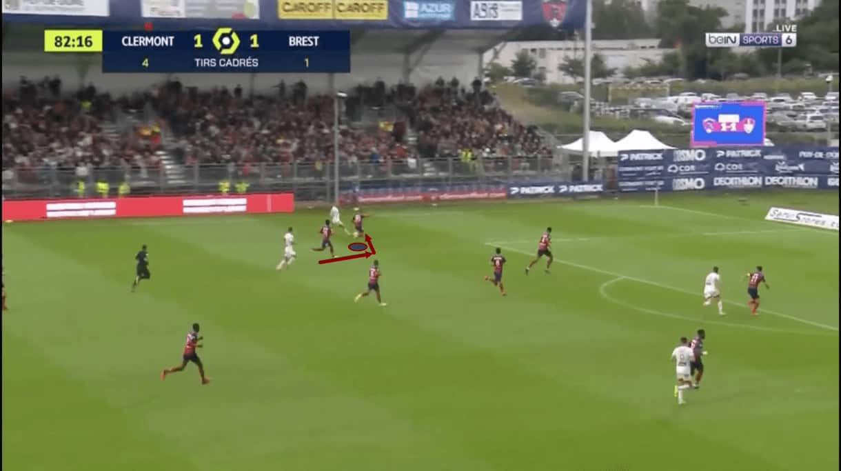 The wings are key to Clermont’s chance creation under Gastien because, as previously mentioned, this team loves to overload one wing or maybe the centre, attract opposition bodies in, and then switch to the opposite wing or release out wide to exploit space that will have opened up. In this particular example, Clermont built their attack into the final third through the centre of the pitch before releasing to Zedadka who we see bombing forward into space on the right-wing.