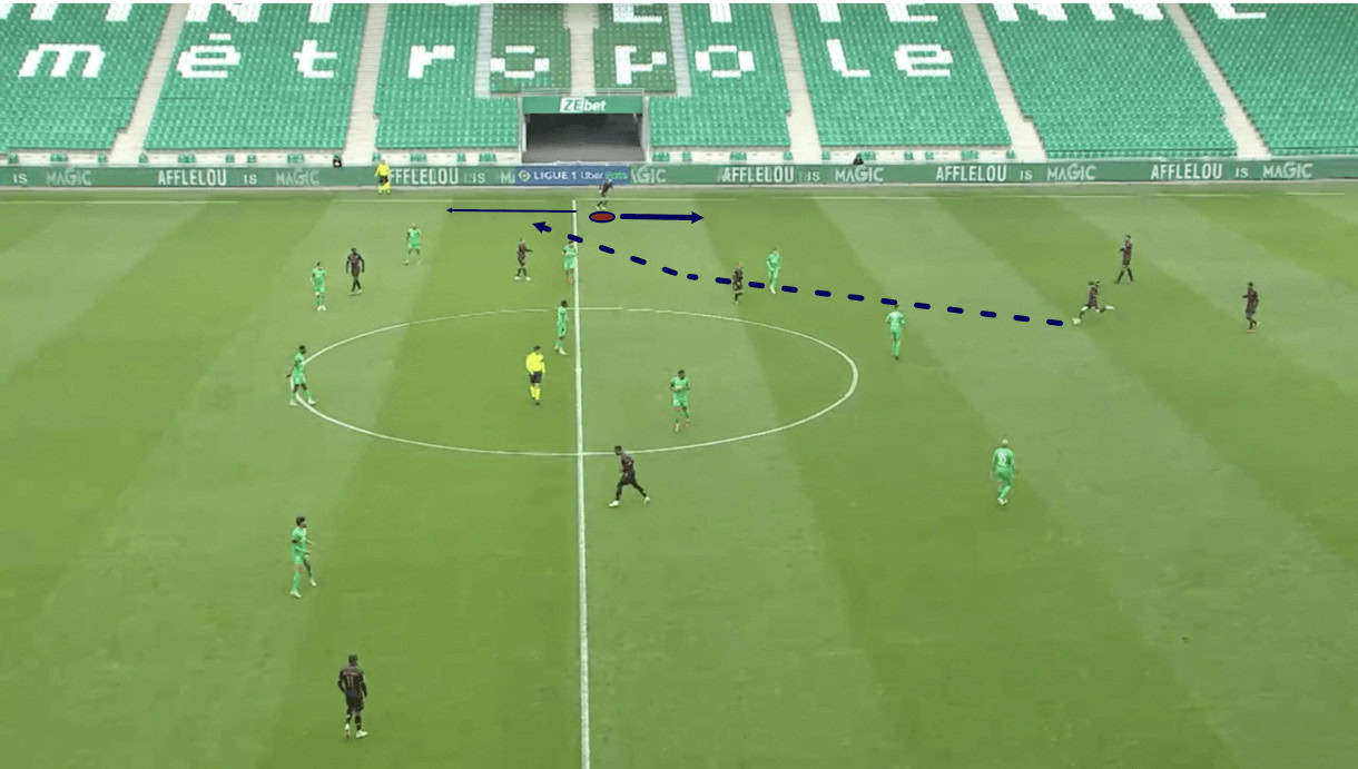 Another positive trait of Zedadka that makes him a good asset for his side when playing out from the back is his willingness to show for the ball — a basic skill but one that he consistently performs to a high level in Ligue 1. Take figure 4 for an example. Here, Clermont’s central midfielder is in possession, facing the opposition half, looking to progress upfield. Meanwhile, Zedadka (highlighted) is occupying a slightly central position, deep in the inside right channel.