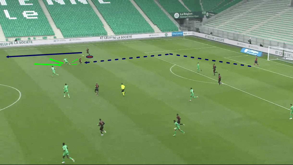 This is where Zedadka’s aggressive forward run proves crucial to the continuation of Clermont’s build-up. In figure 6, the right-back is seen quite deep. This is what allows the opposition left-back to press so high and get so tight to the right central midfielder. At this moment, the Saint-Étienne left-back has nothing to worry about high on Clermont’s right-wing, so he can afford to add an extra body to midfield to stifle Clermont’s build-up. If Zedadka had stayed deep, this could’ve led to a far more successful Saint-Étienne press.