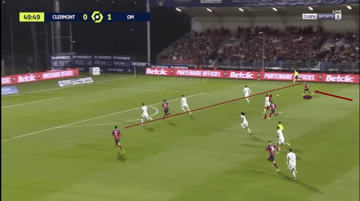 This pass helped Les Lanciers to escape from Marseille’s press and exploit the underloaded side of the pitch, with Les Olympiens having committed a lot of bodies to Zedadka’s wing to prevent Clermont from playing out and forcing a high turnover. The right-back played a key part in ensuring that didn’t happen, however, with many of his key on-the-ball skills on display here, including his agility, balance, composure, and good technical passing ability which is aided by his constant diligent scanning — an element of his game that needs to be highlighted.