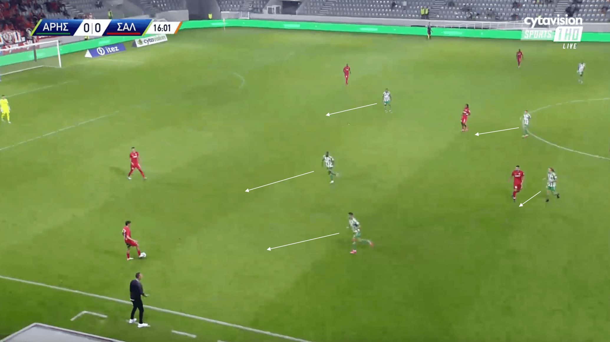 As a result of the midfielder’s movement, the Betis player is forced to play the ball long first time, with the Aris goalkeeper able to claim and the Cypriot side able to reset.