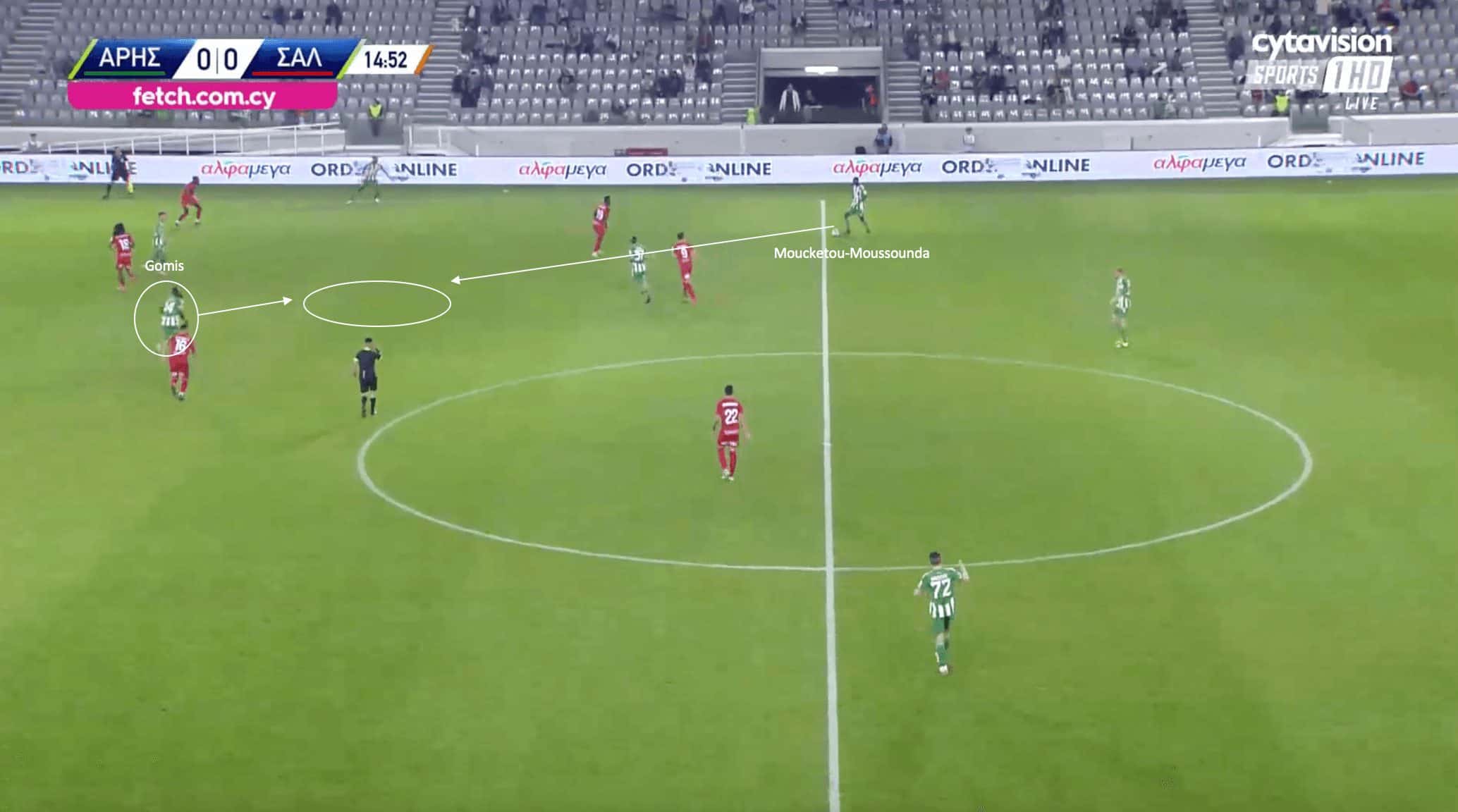 Though the midfielder can engage the forward, Gomis can spin away and drive towards the pinned backs, with the Aris attackers able to create a goalscoring chance.