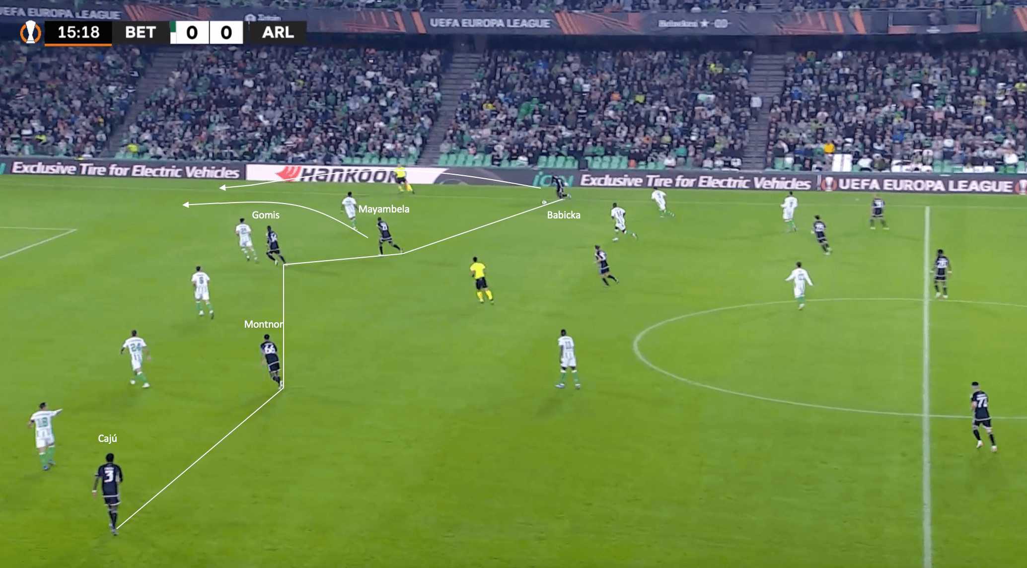 Instead of playing a square pass into the midfield and running into the pocket, Babicka looks to play behind the Real Betis backline.