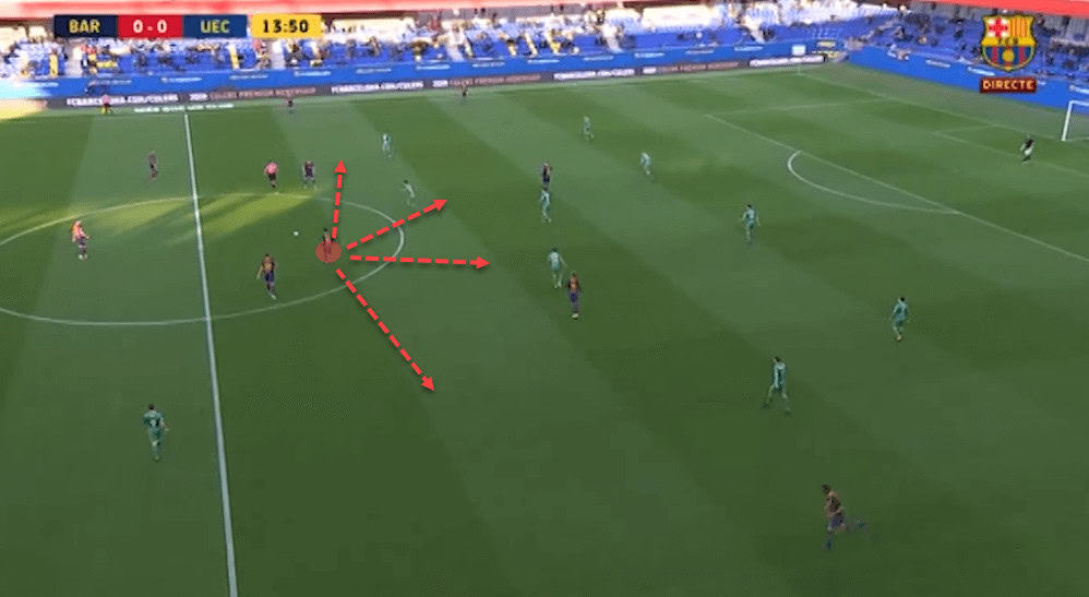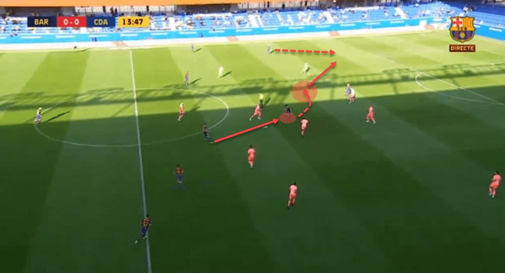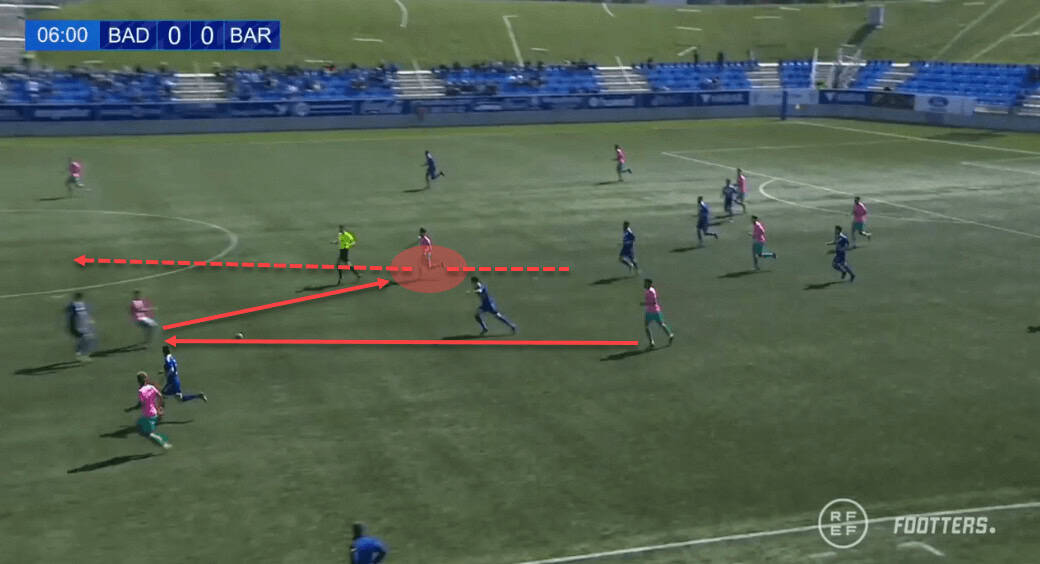 Collado receives the ball between opposition lines and makes a one-touch turn to progress towards the final third of the pitch. Once in position, he attempts a pass beyond the other team’s backline but the ball is, sadly for Barcelona, intercepted.