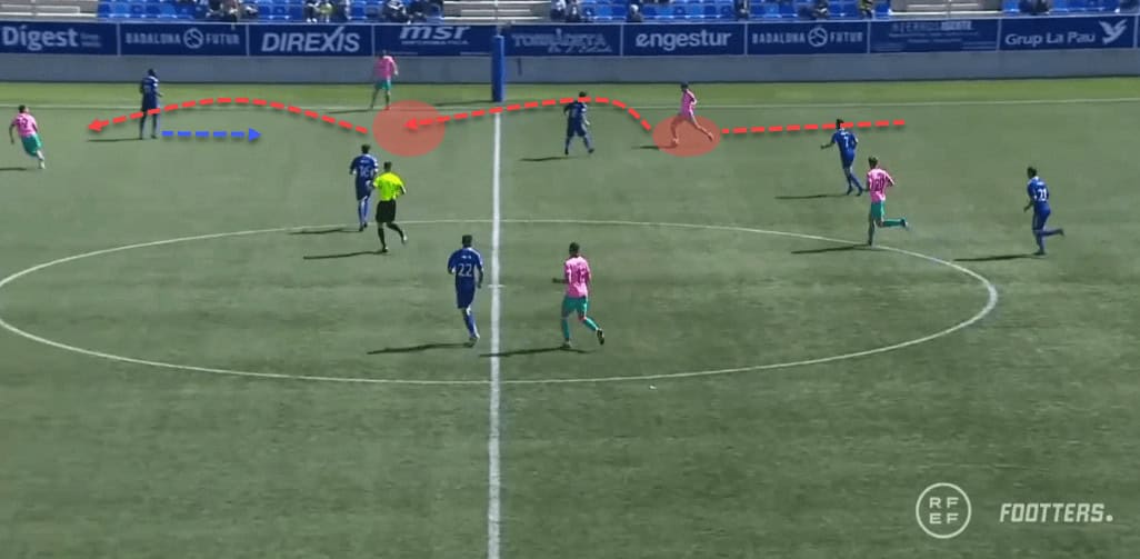 This example shows us Barcelona B during a quick counter-attack where Collado receives the ball in Blaugrana’s half and proceeds to run with it, exploiting the free space the opposition has left in their midfield.