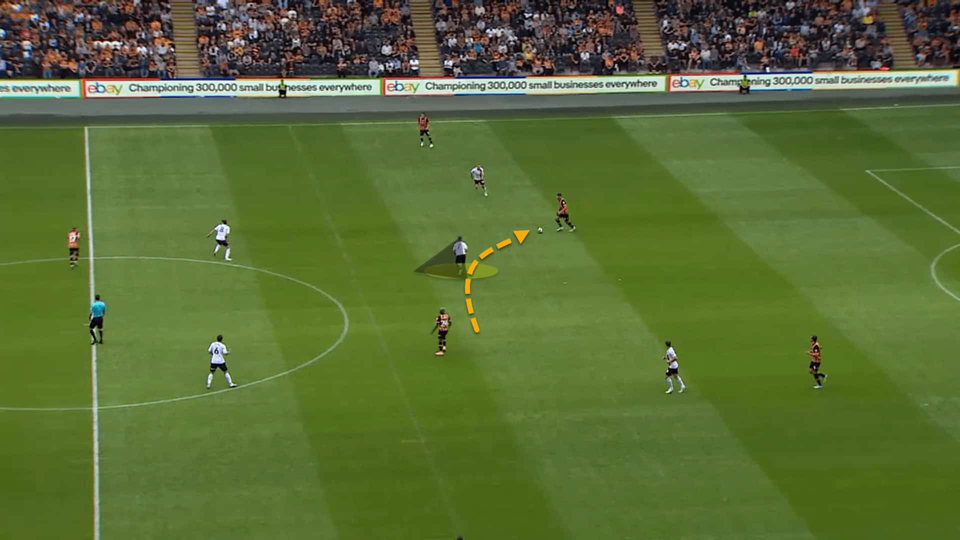 Hull’s centre-back had far too much time and space on the ball and so, leaving his man, Scott began pressing the ball-carrier but applied a cover shadow into the midfielder at the same time, killing two birds with one stone. He did this by curving his pressure to cut off the passing lane, forcing the centre-back to rush his pass.