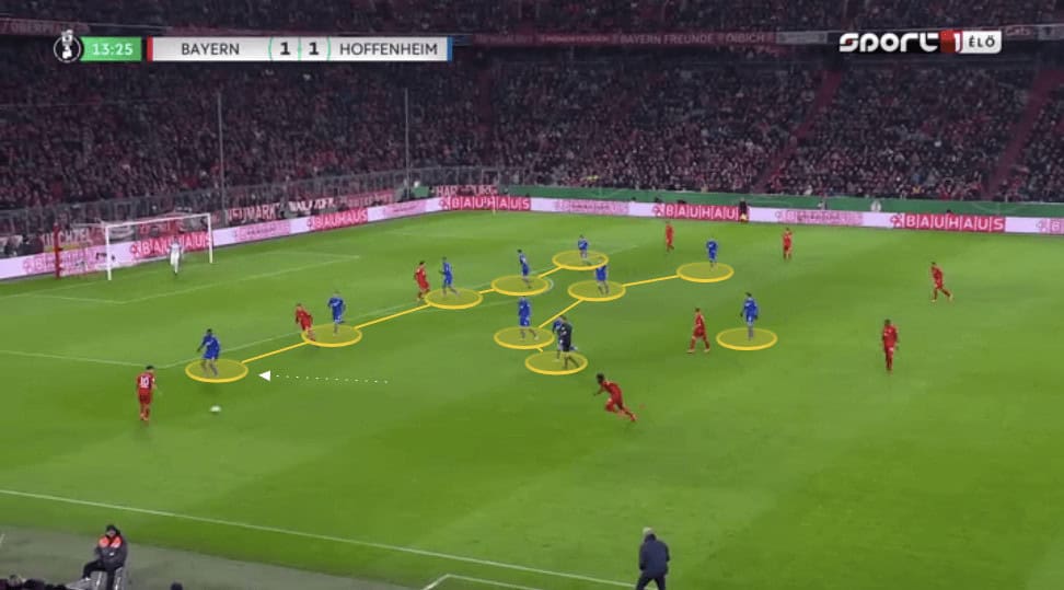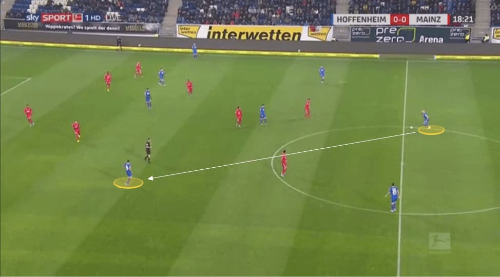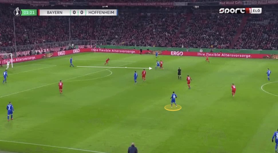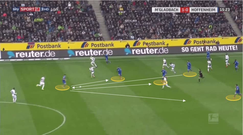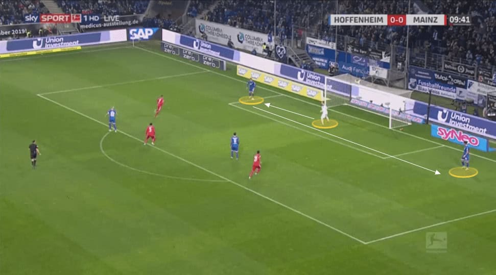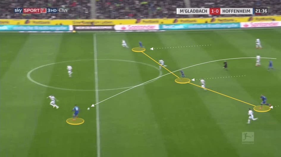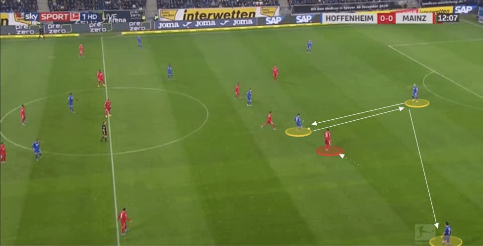 Against these stronger teams Hoffenheim will drop considerable numbers back, whilst leaving a forward up, but close enough to receive a pass to feet as soon as they win back possession. We will then see the simple up, back, and through passing pattern which they use regularly with their use of third man runners.