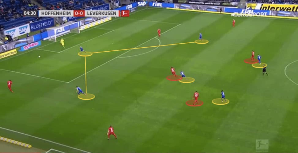 The image below shows how Schreuder set up to prevent Leverkusen’s midfield three getting on the ball with man-marking, whilst Hoffenheim’s front three press Leverkusen’s central-defenders to force them to either play wide or long.