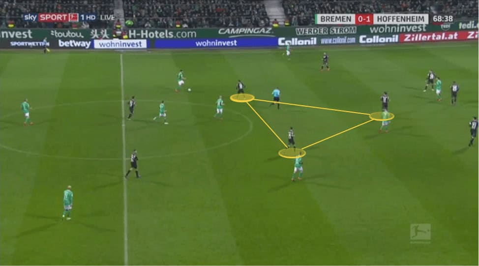 Protecting central areas is a recurring them in their defensive shape though and they will look to do this regardless of formation. In the below example against Werder Bremen, where they did play a 3-5-2 we can see their midfield three in a narrow triangle, showing the opposition ball-carrier away from the middle of the pitch.