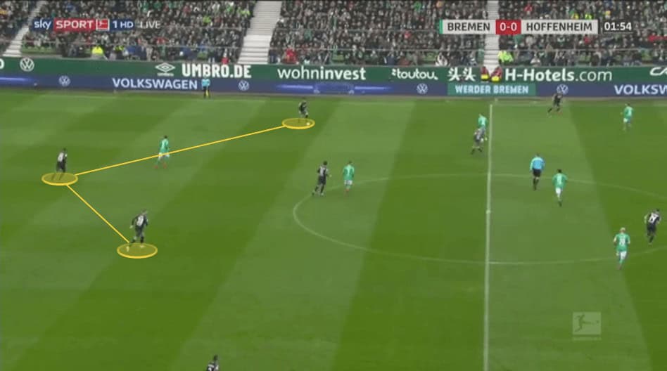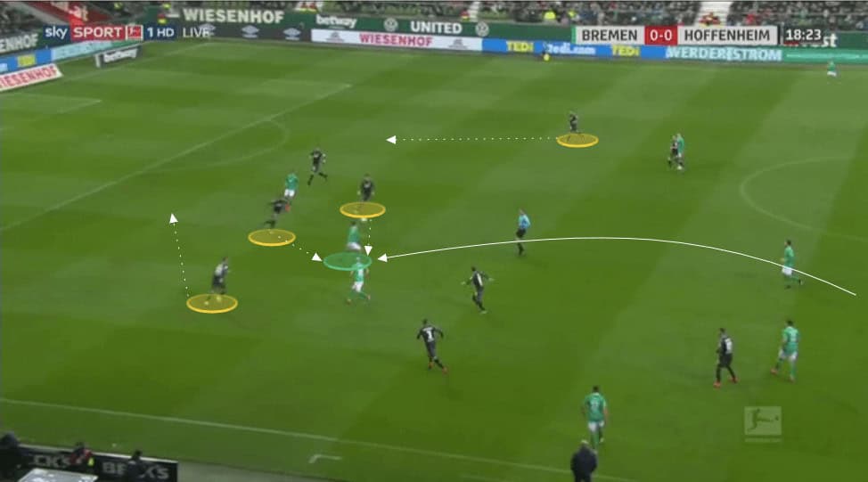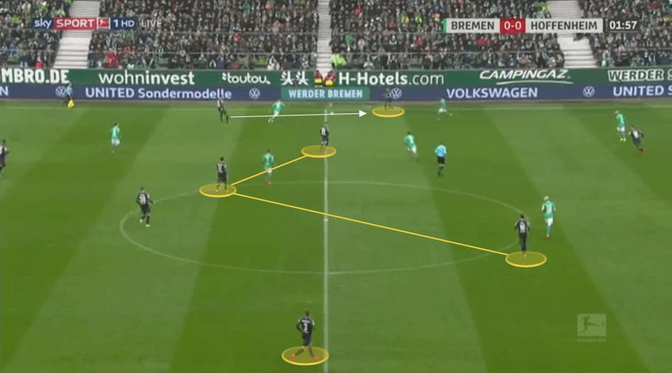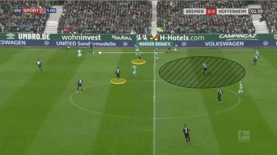 As Bremen play the ball backwards we can see Akpoguma and Grillitsch are sat in front of a back three.