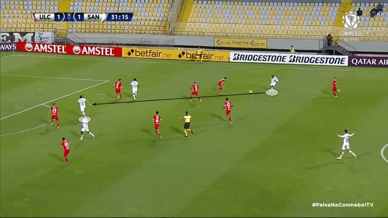 As Santos attempt to break down Unión La Calera’s low block, the 17-year-old drives into the final third.